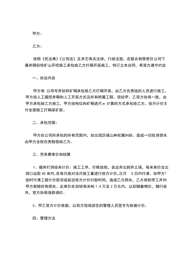 在联合有限责任公司下属井硐铅锌矿山开挖施工承包给乙方打硐开采施工,特订立本合同,希双方遵守约定。