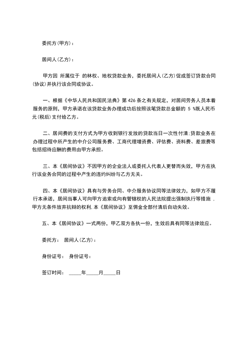 一、根据《中华人民共和国民法典》第426条之有关规定,对居间劳务人员本着服务的原则,甲方承诺在该贷款业务办理成功后按照该笔贷款总金额的 5 %既人民币: 元(税后)支付给乙方。