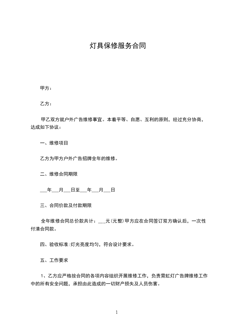 1、乙方应严格按合同的各项内容组织开展维修工作,负责霓虹灯广告牌维修工作中的所有安全问题,承担由此造成的一切财产损失及人员伤害。
