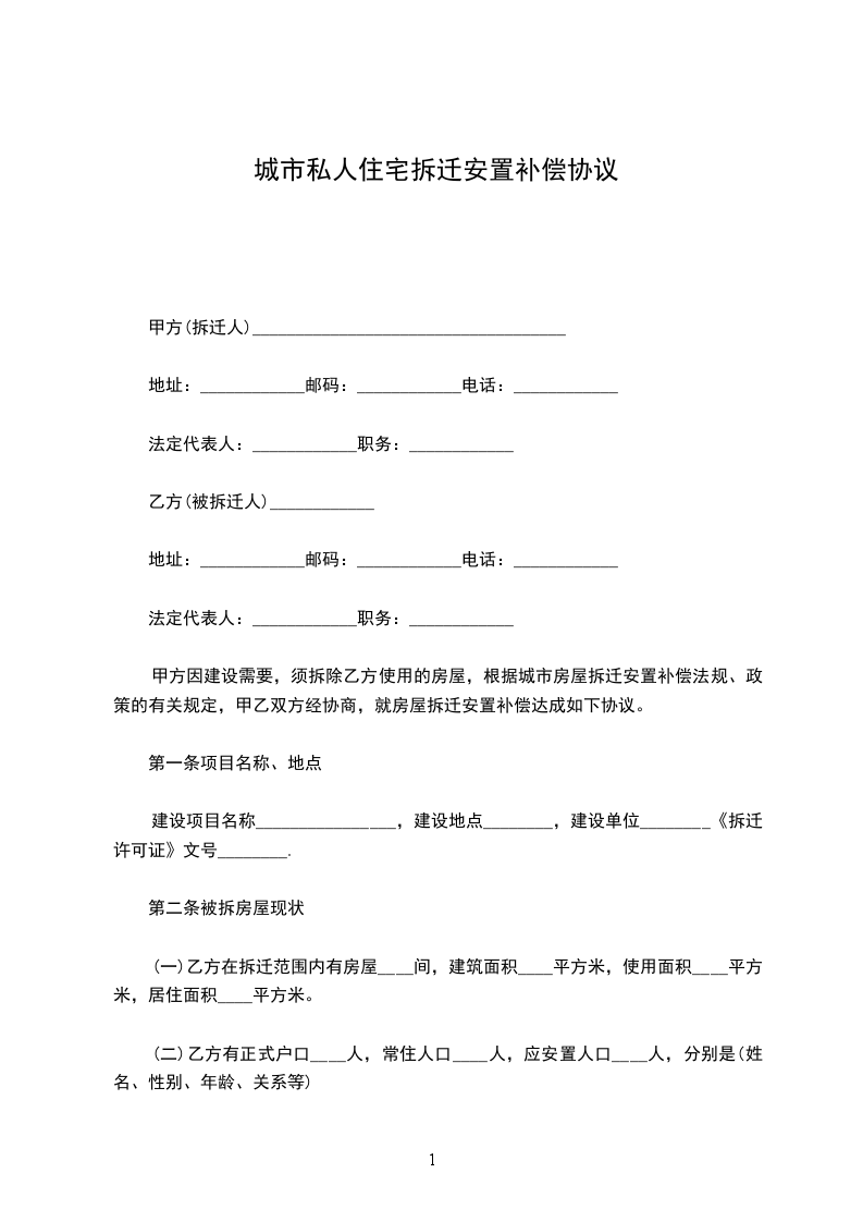 城市私人住宅拆迁安置补偿协议