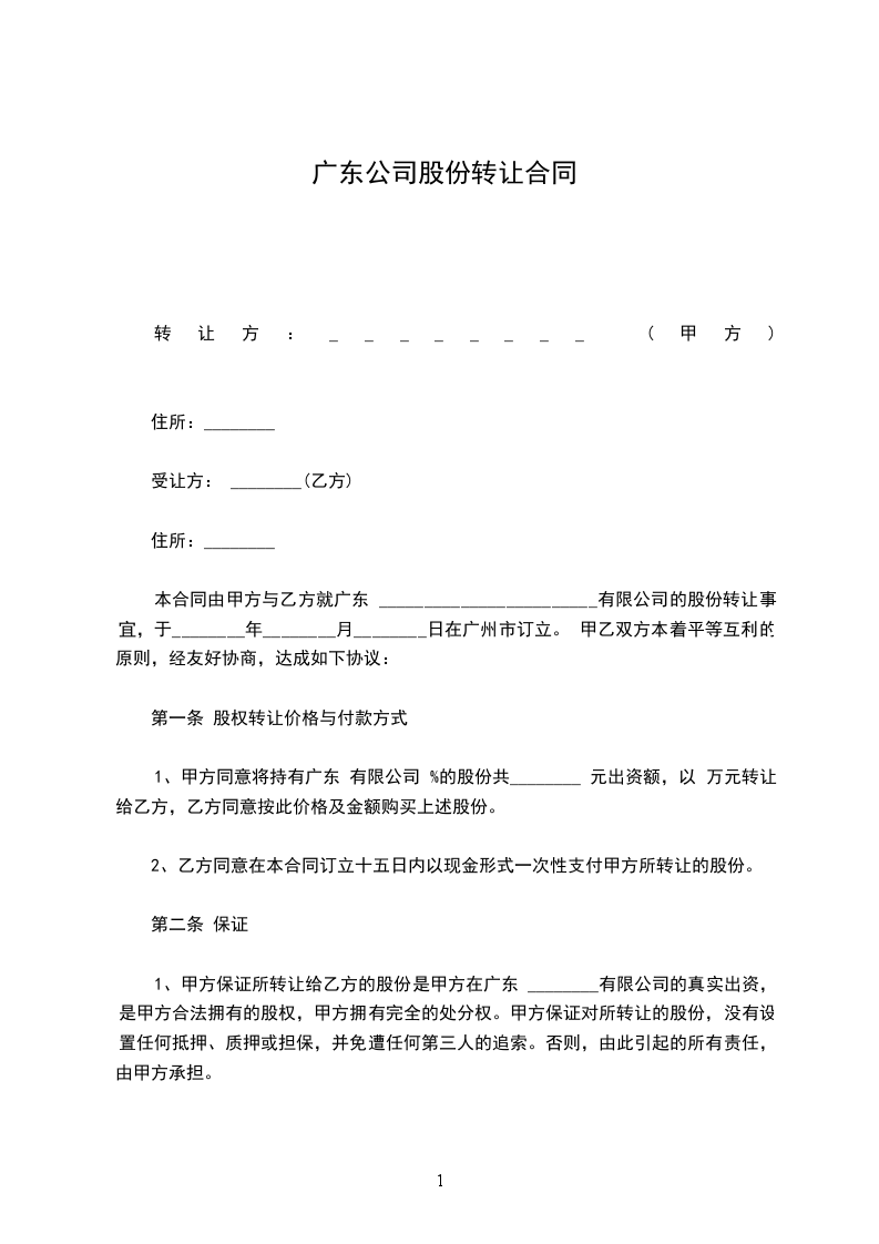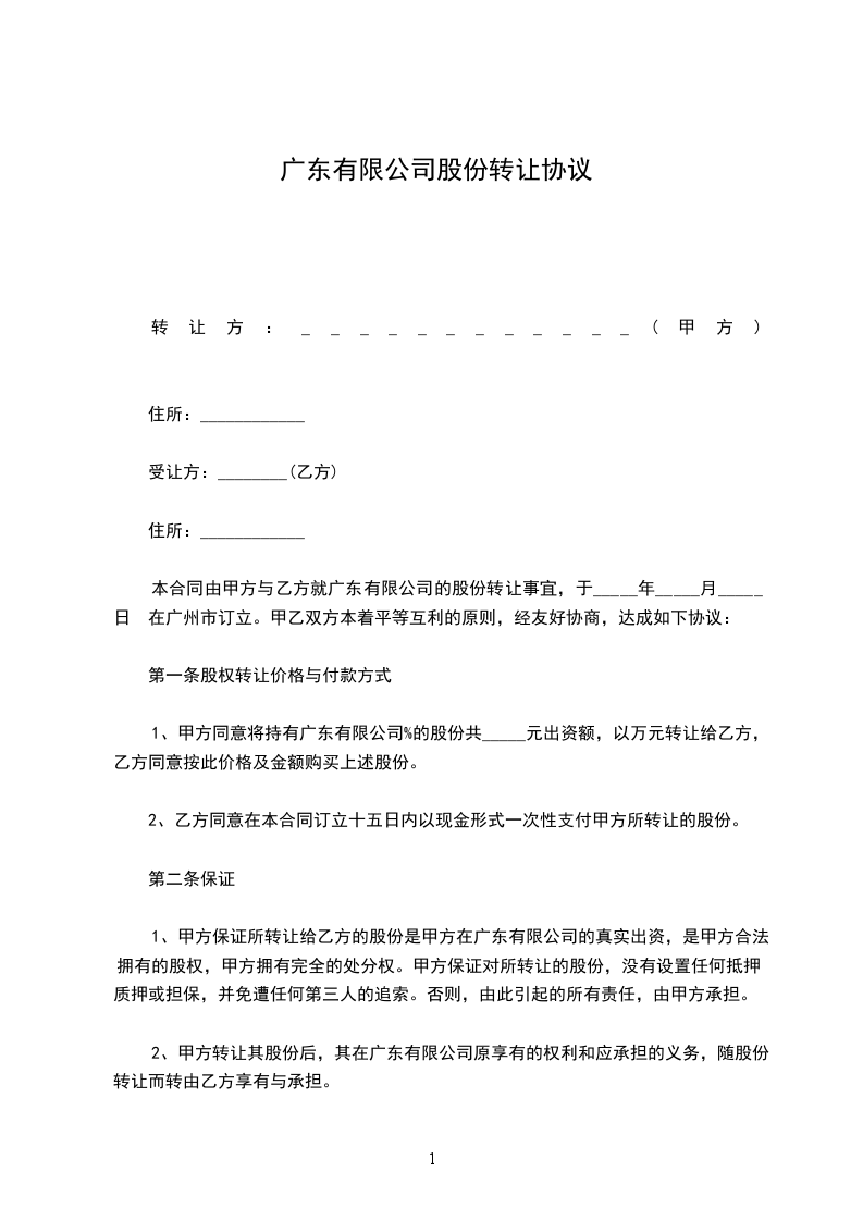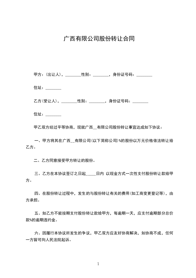 一、转让方将其在__________________公司(以下简称公司)_______%的股份(人民币_________元)依法转让给受让方。