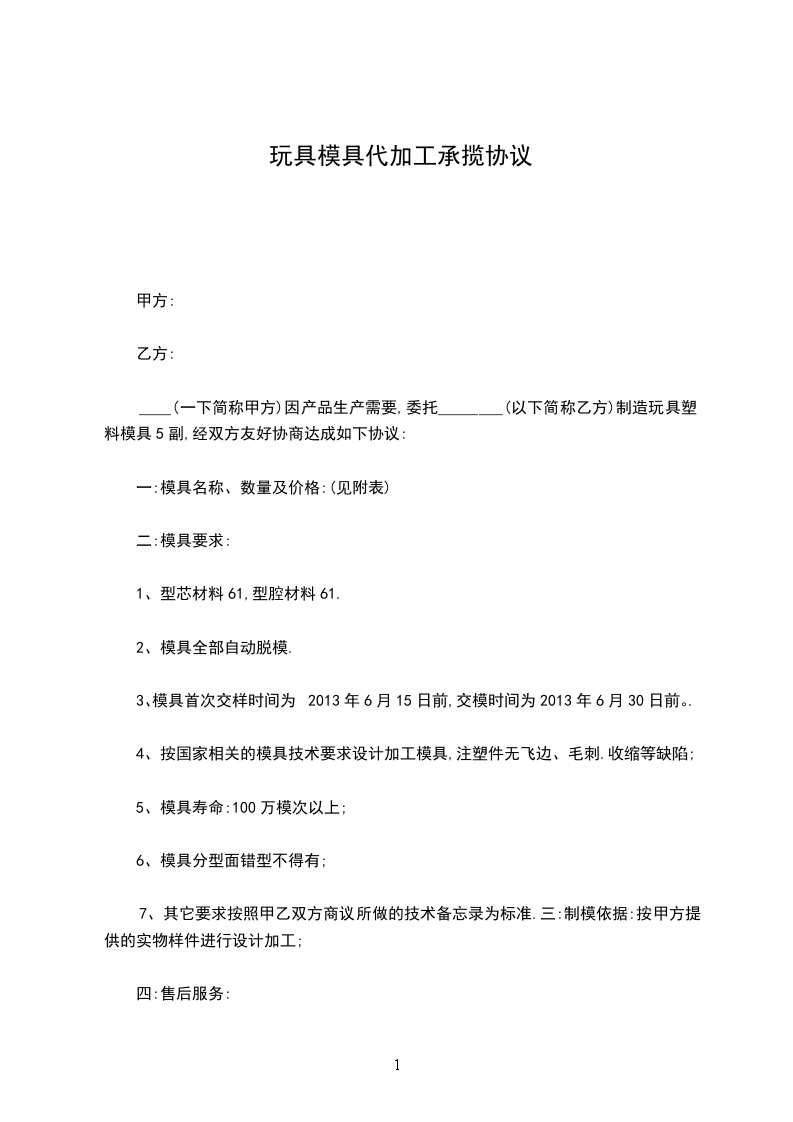 ____(一下简称甲方)因产品生产需要,委托________(以下简称乙方)制造玩具塑料模具5副,经双方友好协商达成如下协议: