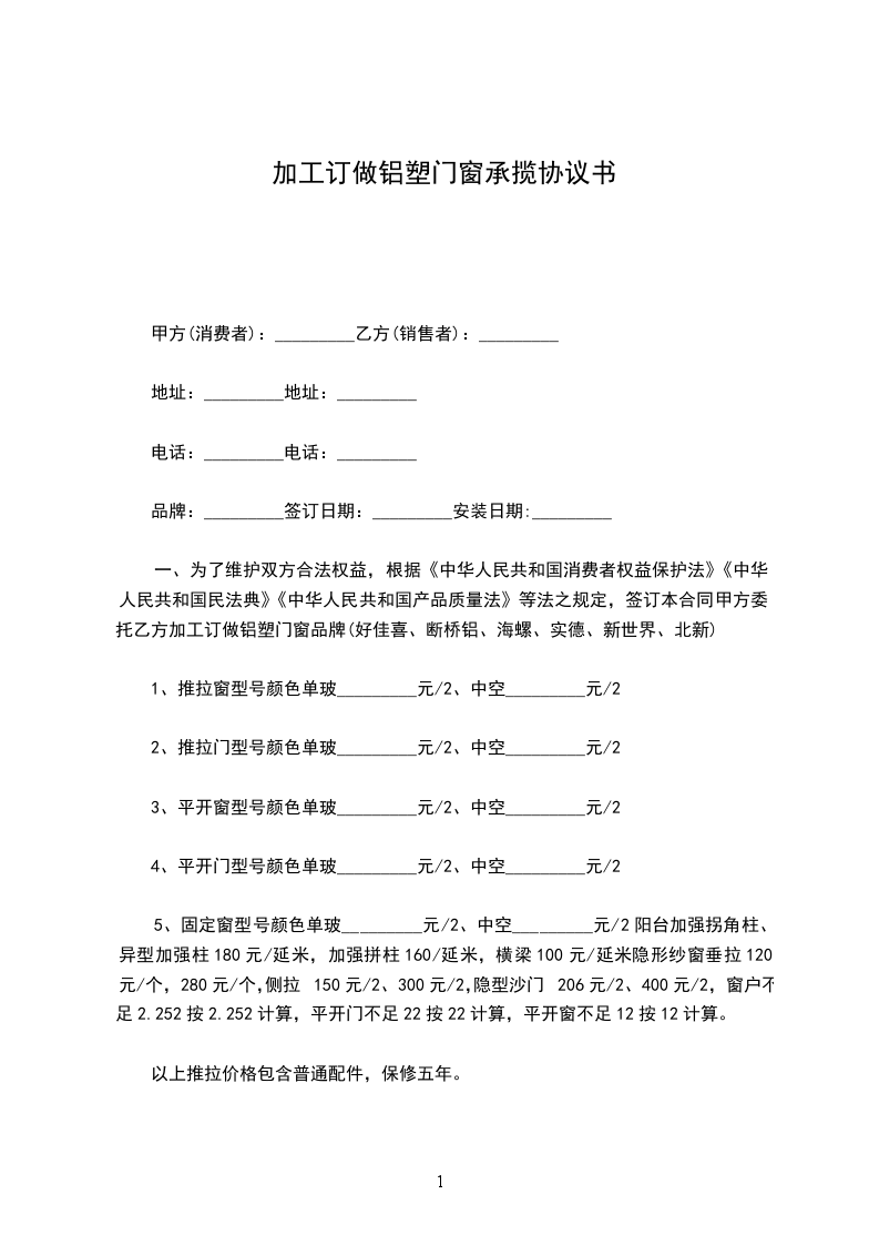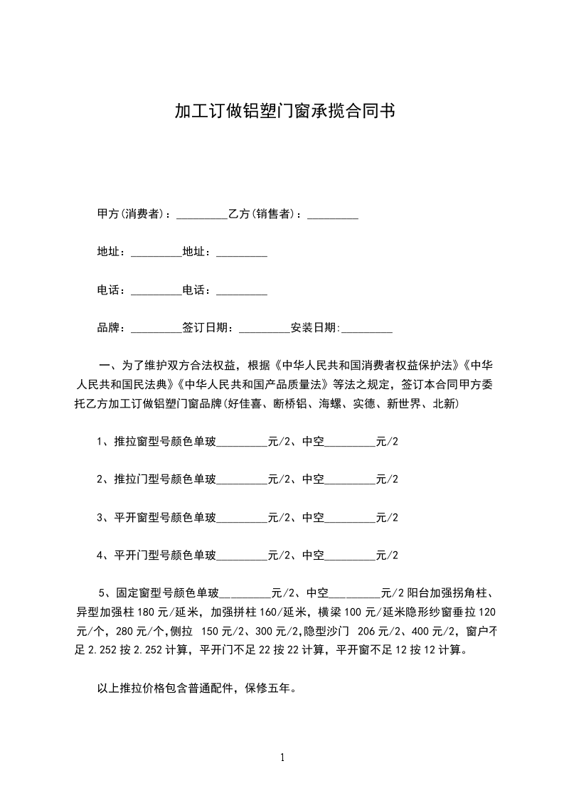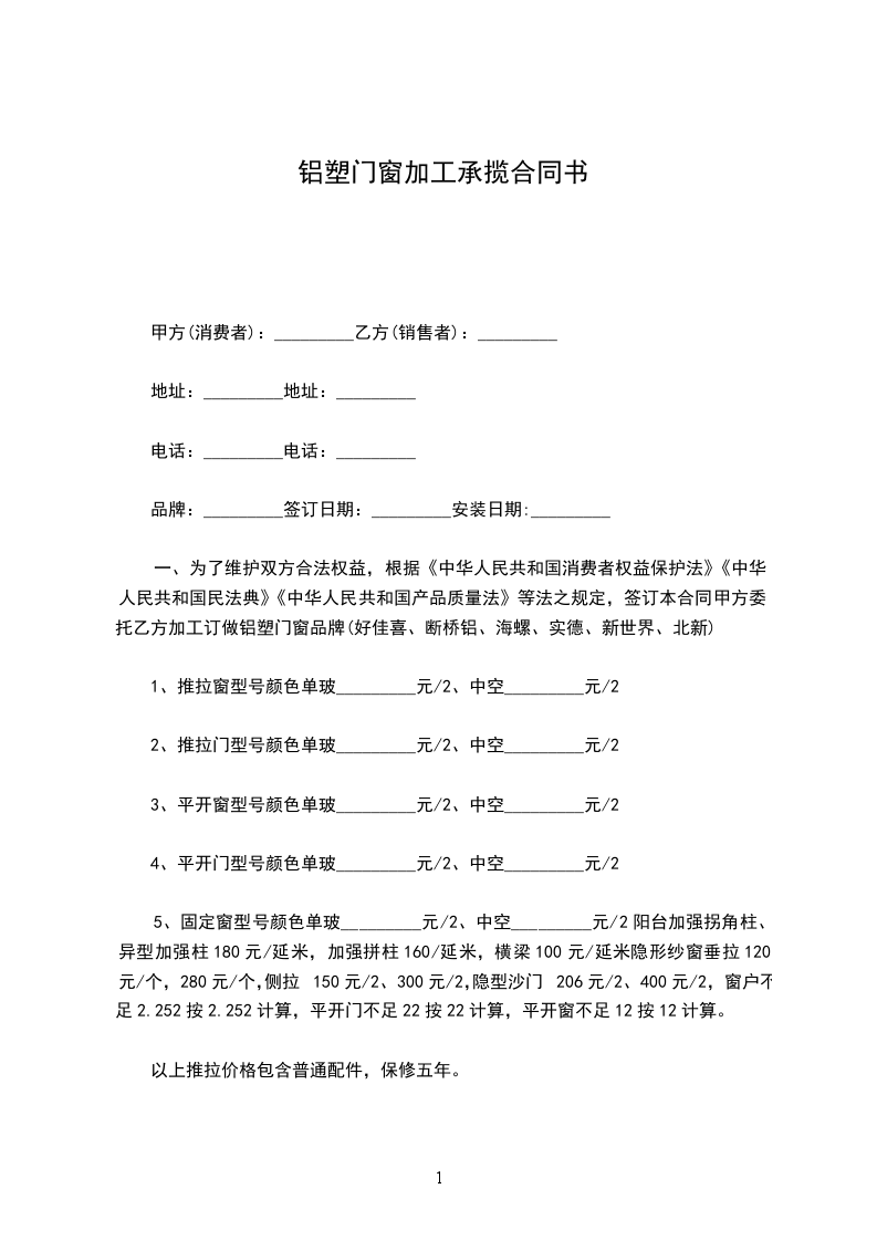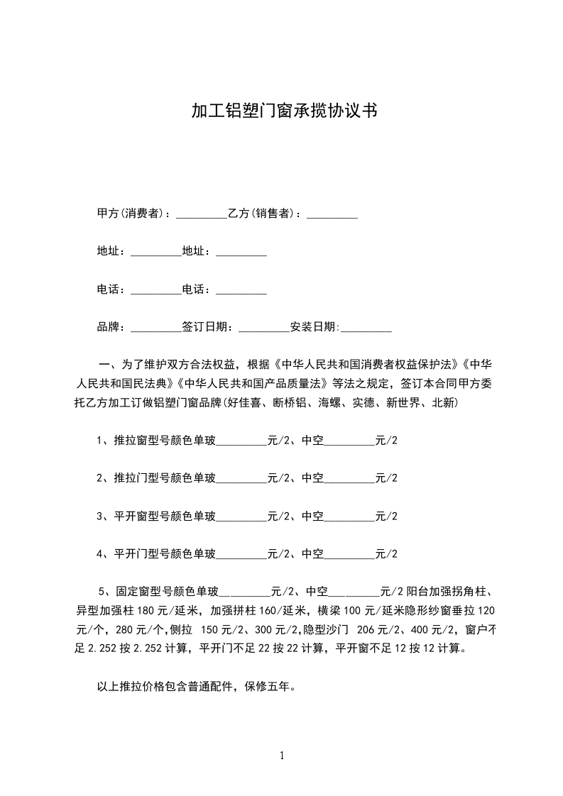一、为了维护双方合法权益,根据《中华人民共和国消费者权益保护法》《中华人民共和国民法典》《中华人民共和国产品质量法》等法之规定,签订本合同甲方委托乙方加工订做铝塑门窗品牌(好佳喜、断桥铝、海螺、实德、新世界、北新)