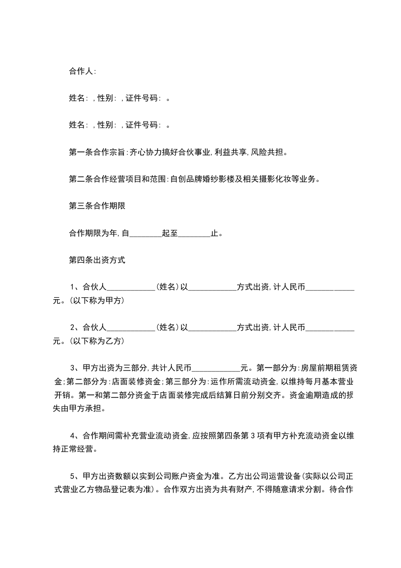 第二条合作经营项目和范围:自创品牌婚纱影楼及相关摄影化妆等业务。