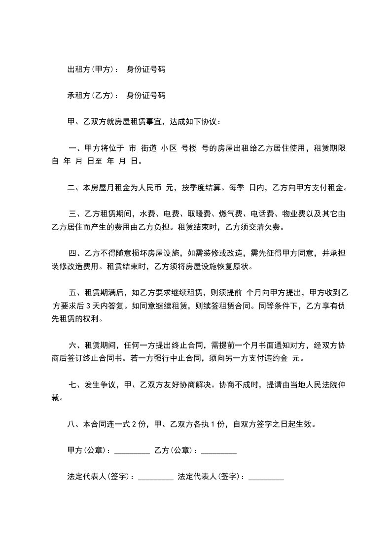 一、甲方将位于 市 街道 小区 号楼 号的房屋出租给乙方居住使用,租赁期限自 年 月 日至 年 月 日。