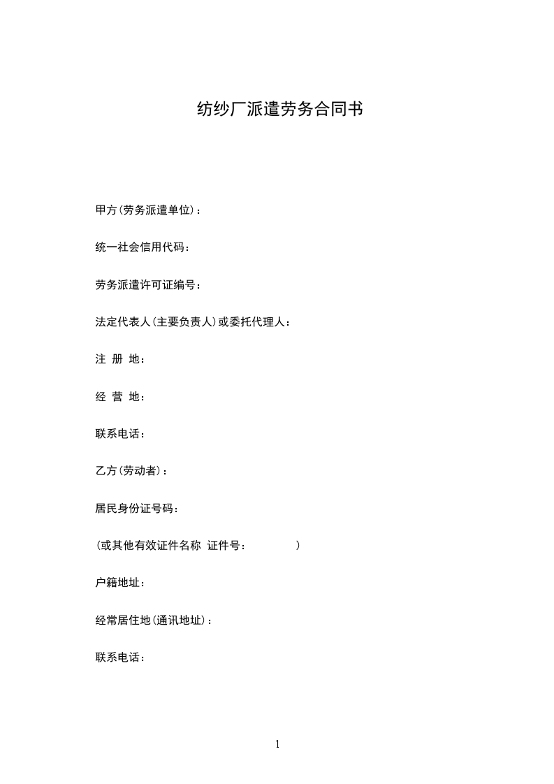 纺纱厂派遣劳务合同范文