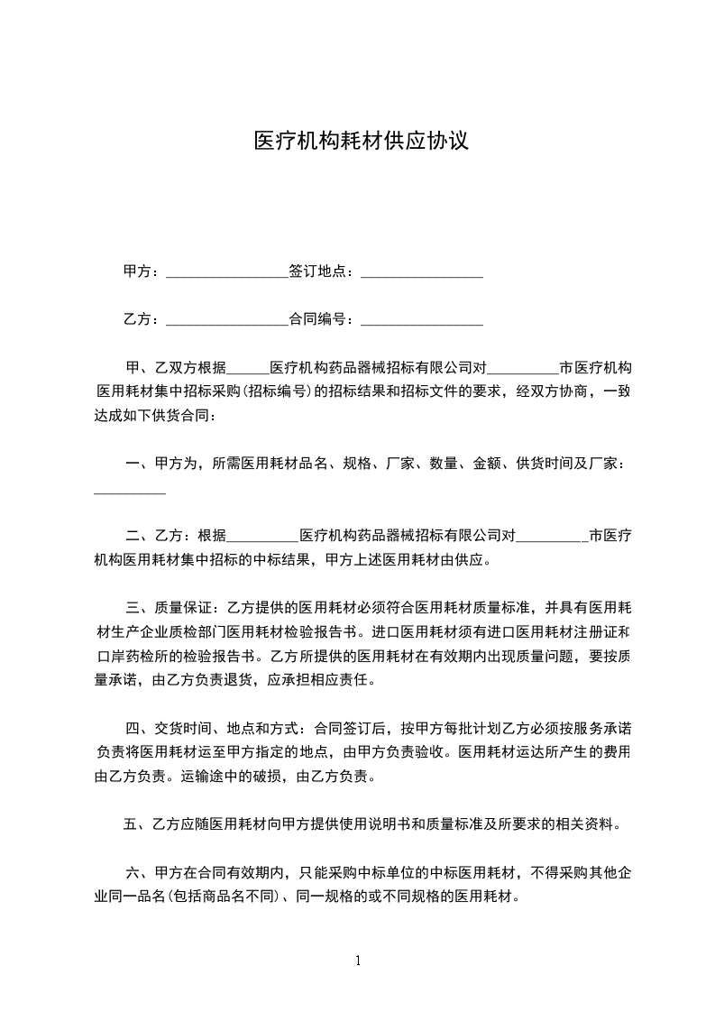 甲、乙双方根据__________________年_____月_____日__________医疗机构药品器械招标有限公司对__________市医疗机构医用耗材集中招标采购(招标编号)的招标结果和招标文件的要求,经双方协商,一致达成如下供货合同:_________________