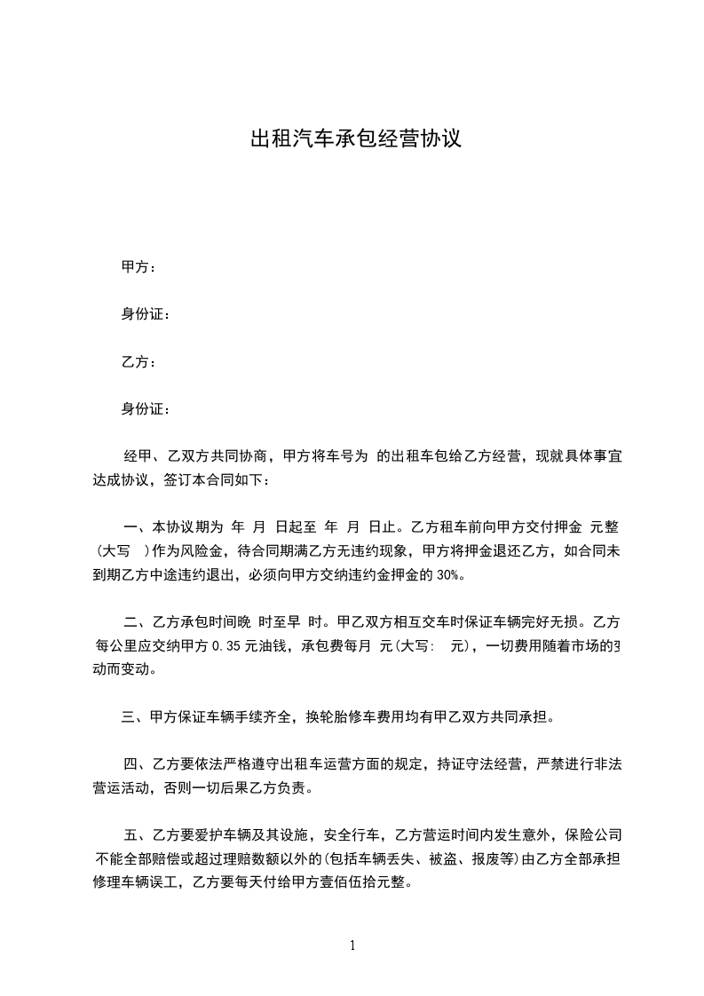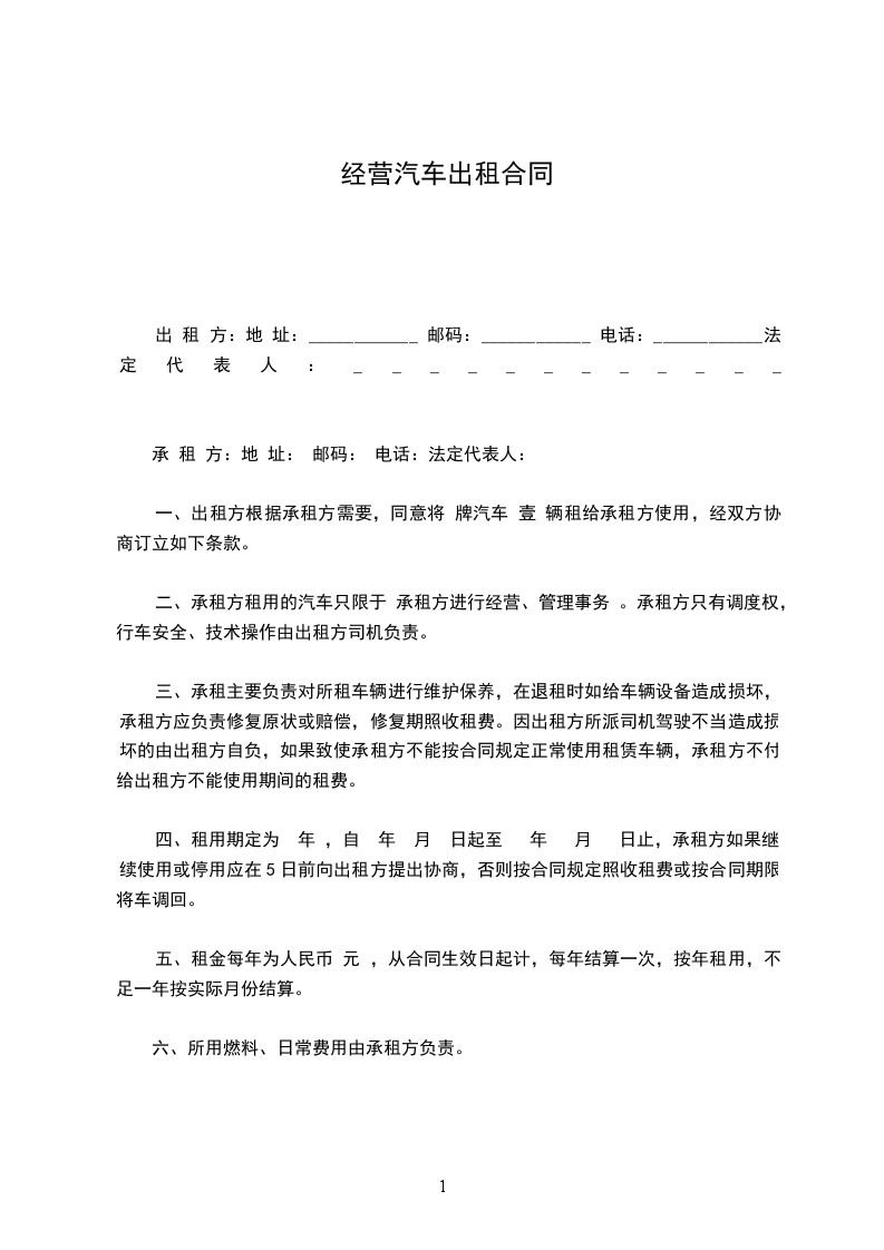 一、出租方根据承租方需要,同意将 牌汽车 壹 辆租给承租方使用,经双方协商订立如下条款。