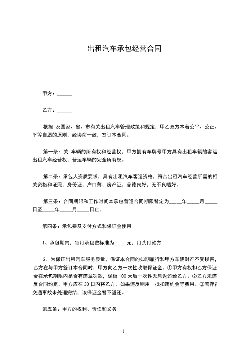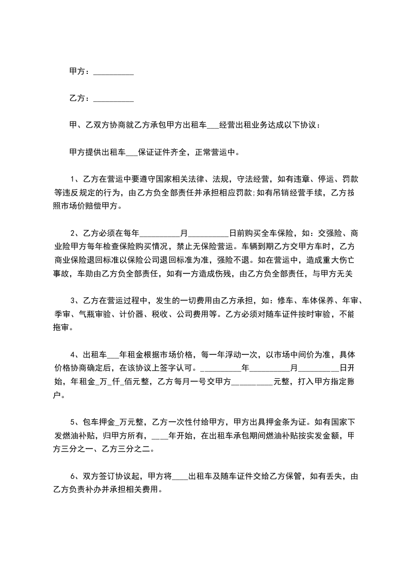 四、租用期定为 年 ,自 年 月 日起至 年 月 日止,承租方如果继续使用或停用应在5日前向出租方提出协商,否则按合同规定照收租费或按合同期限将车调回。