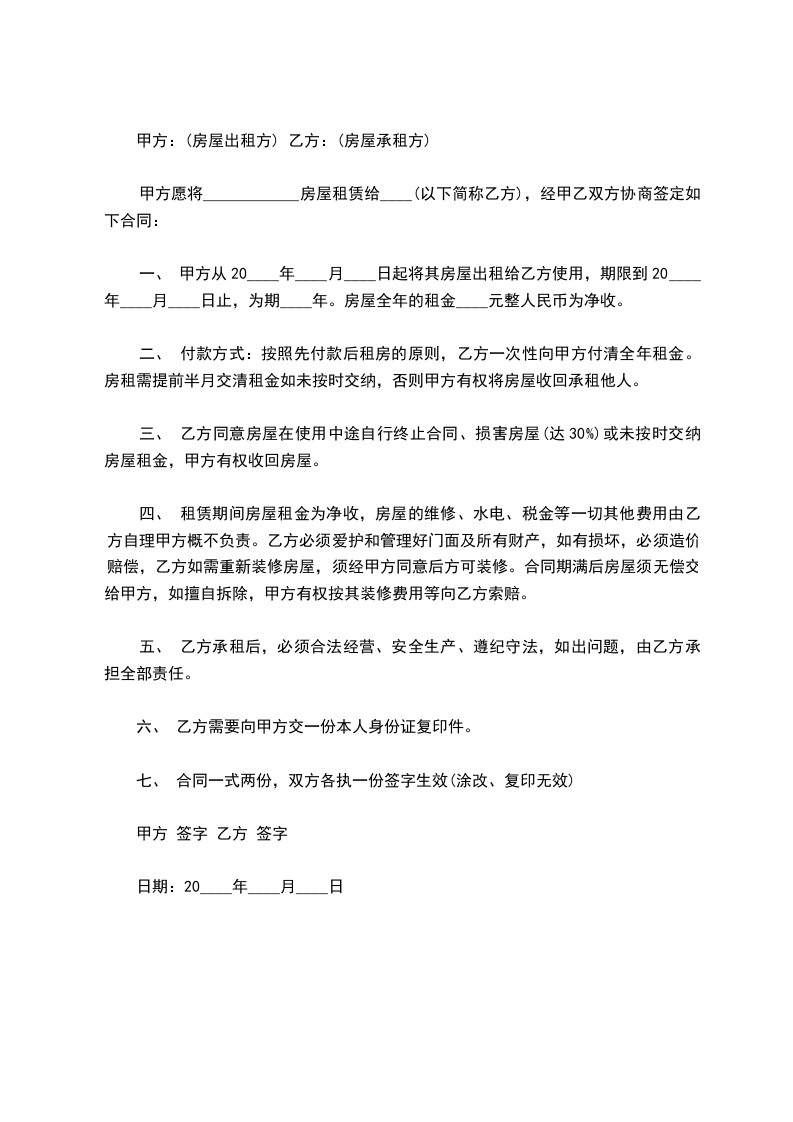 一、 甲方从20____年____月____日起将其房屋出租给乙方使用,期限到20____年____月____日止,为期____年。房屋全年的租金____元整人民币为净收。