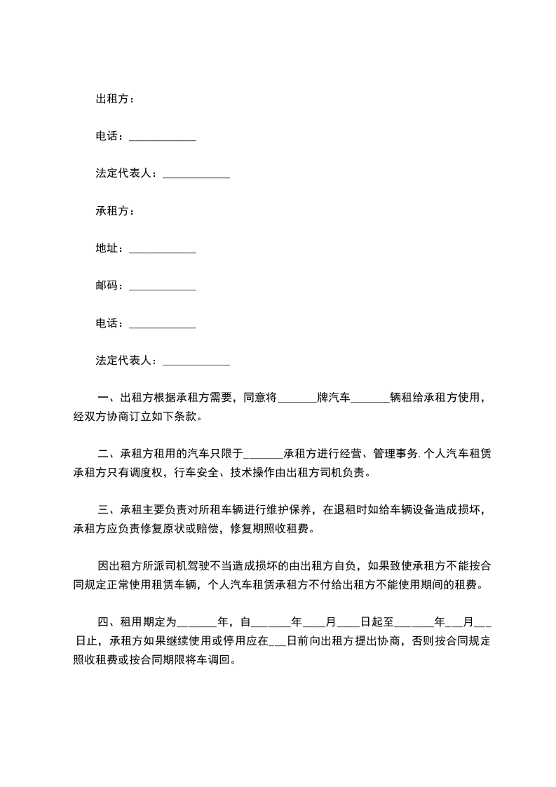 二、合同期内车辆租赁总费用费用为 元整,合同终止后乙方提供发票之日一次性支付。