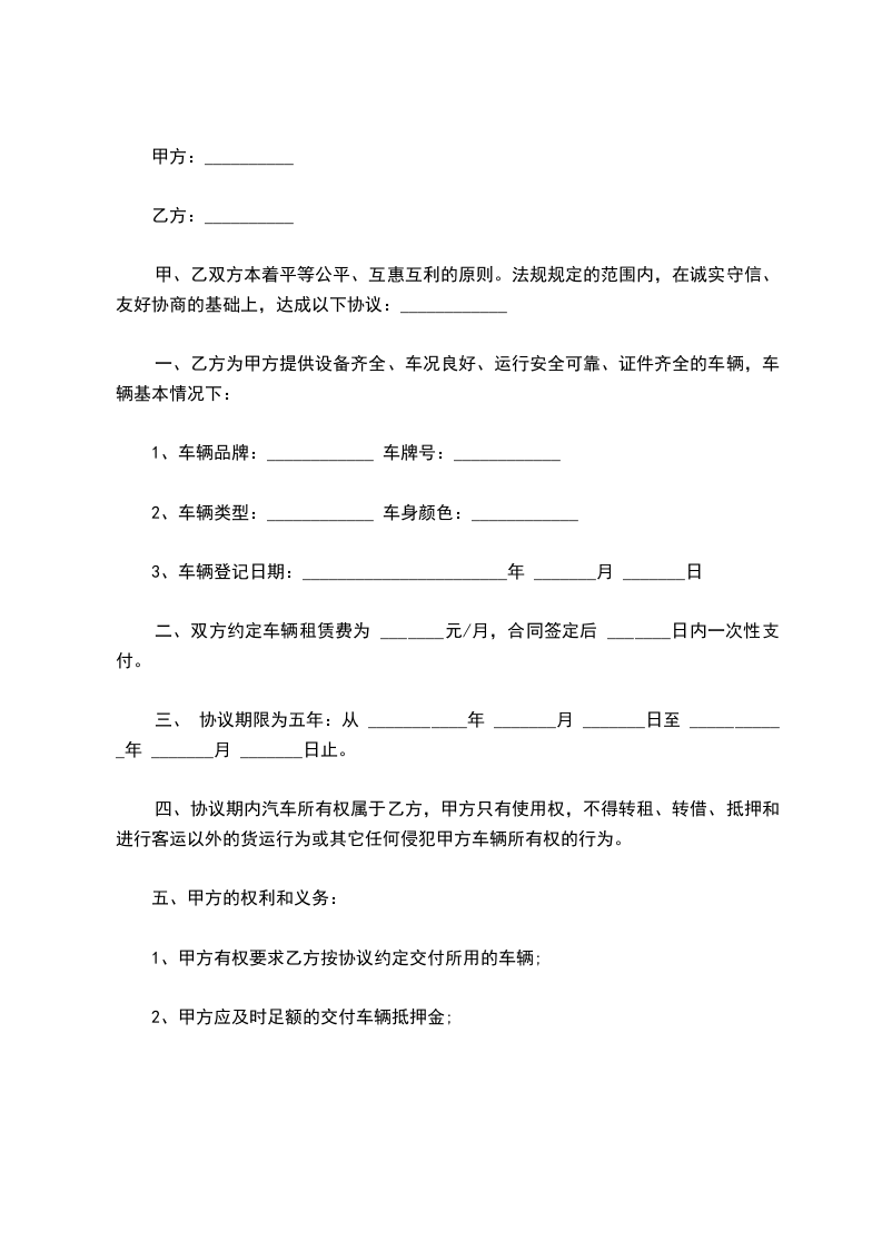 四、协议期内汽车所有权属于乙方,甲方只有使用权,不得转租、转借、抵押和进行客运以外的货运行为或其它任何侵犯乙方车辆所有权的行为。