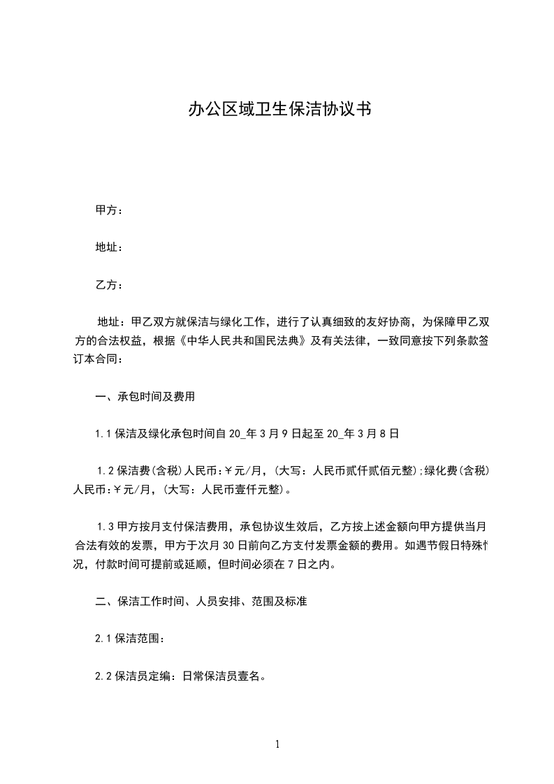 1.1保洁及绿化承包时间自20_年3月9日起至20_年3月8日