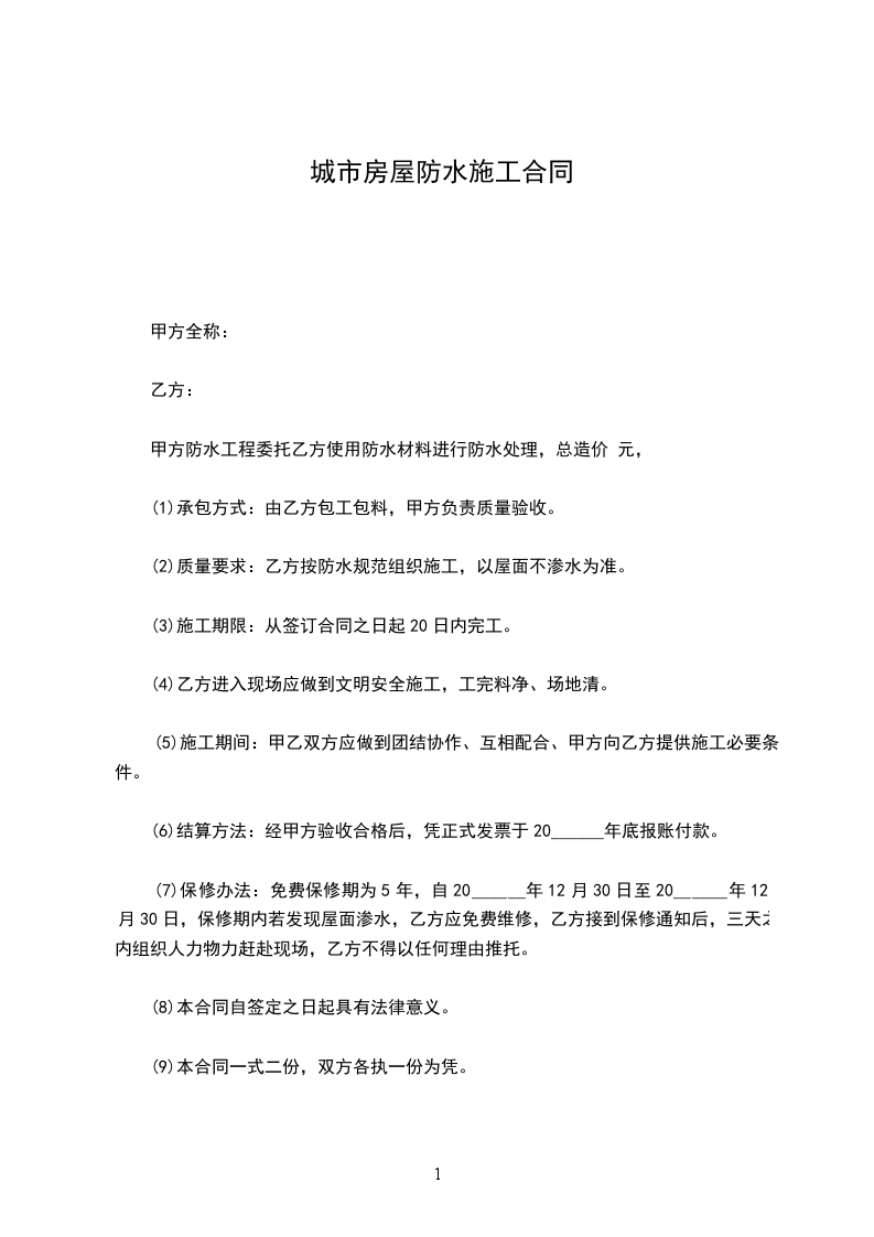 10、付款办法:在合同签订后支付合同价的30%作为预付款,竣工验收合格后一次性付清工程款。保修期一年。