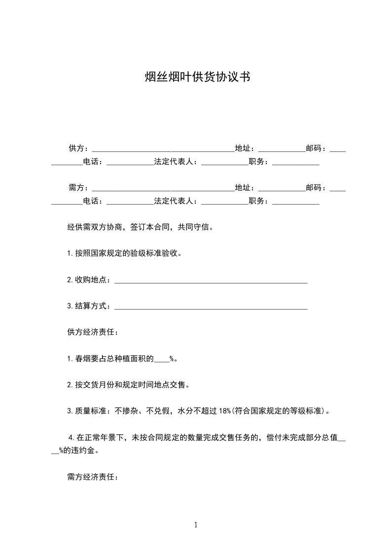 1.对交售的烟叶必须按国家规定的等级和价格标准按质论价,付给供方货款,不得压级压价;如有压级压价,除还足压价部分货款外,应按压价总值____%偿付违约金。