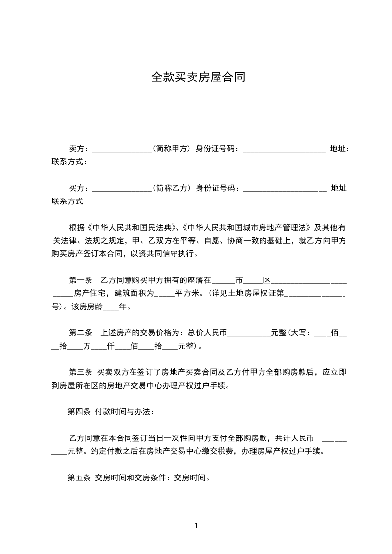 乙方同意在本合同签订当日一次性向甲方支付全部购房款,共计人民币 __________元整。约定付款之后在房地产交易中心缴交税费,办理房屋产权过户手续。
