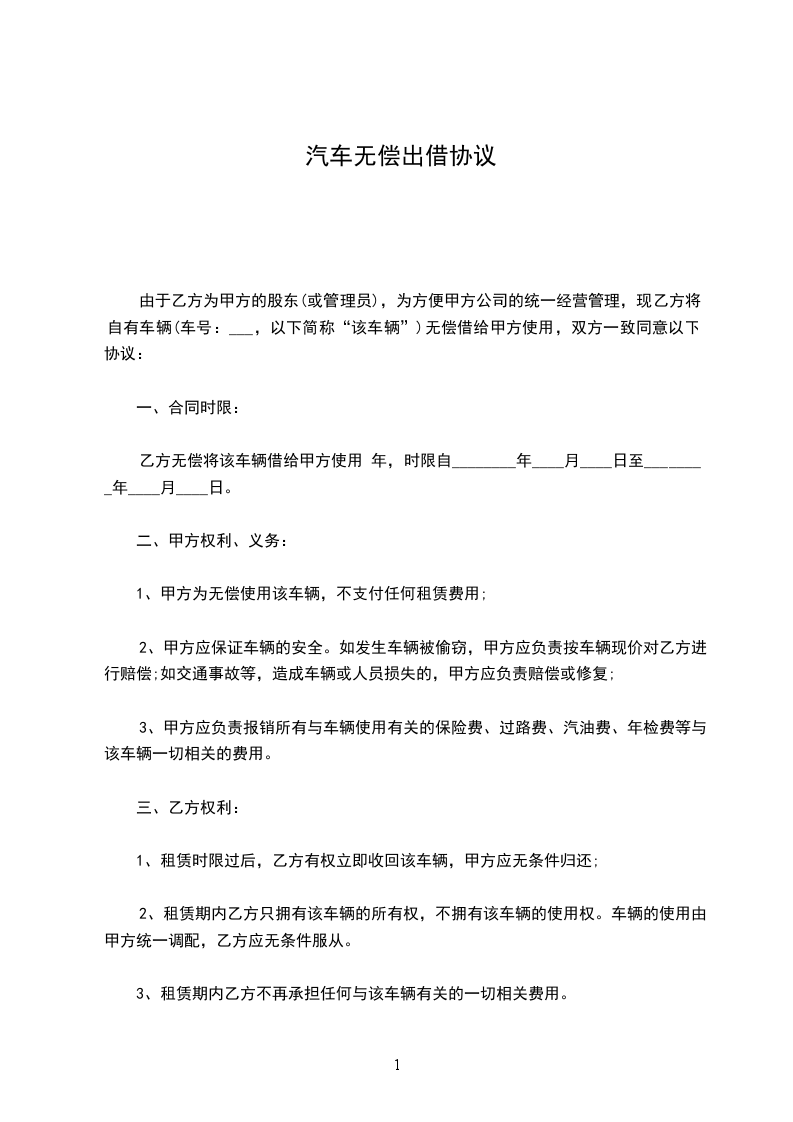 由于乙方为甲方的股东(或管理员),为方便甲方公司的统一经营管理,现乙方将自有车辆(车号:___,以下简称“该车辆”)无偿借给甲方使用,双方一致同意以下协议:
