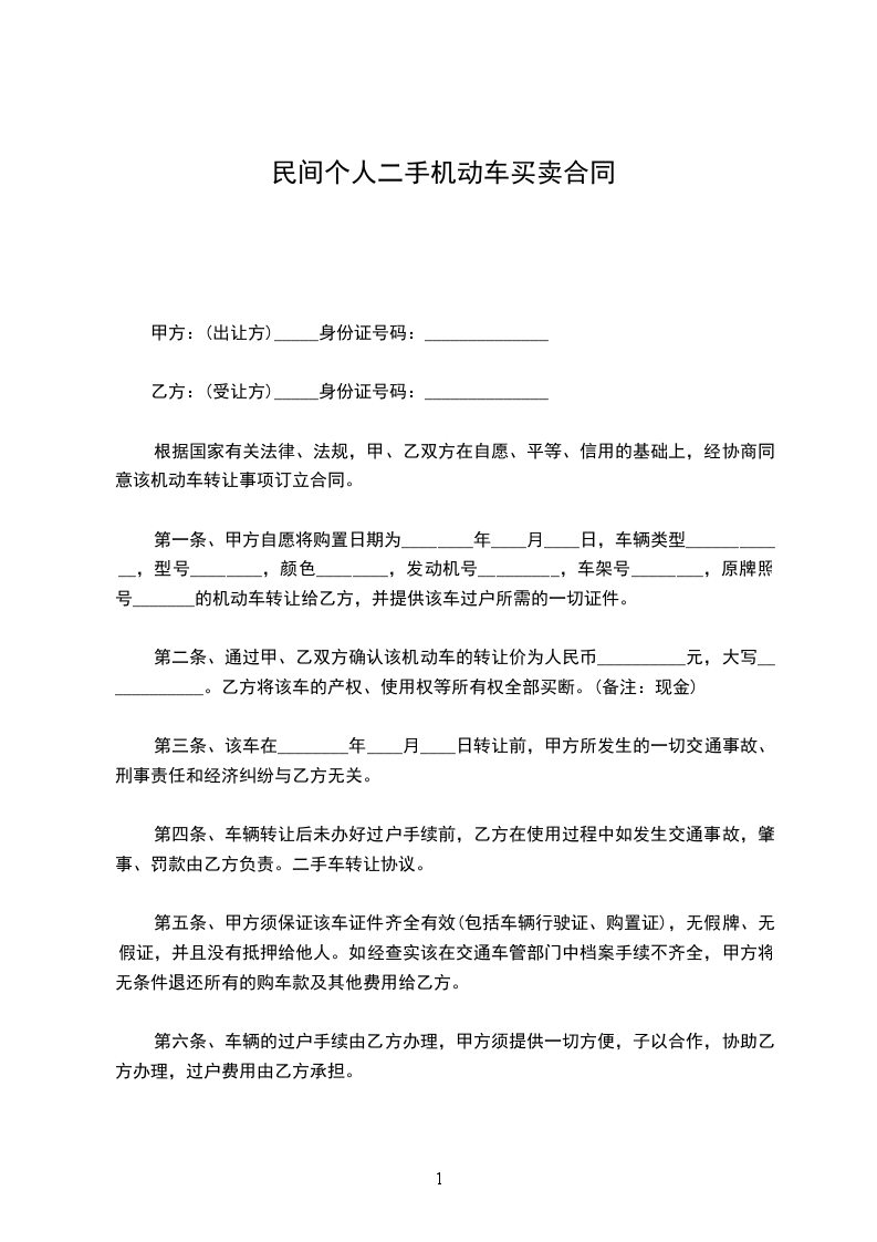 第一条、甲方自愿将购置日期为________年____月____日,车辆类型____________,型号________,颜色________,发动机号_________,车架号________,原牌照号_______的机动车转让给乙方,并提供该车过户所需的一切证件。