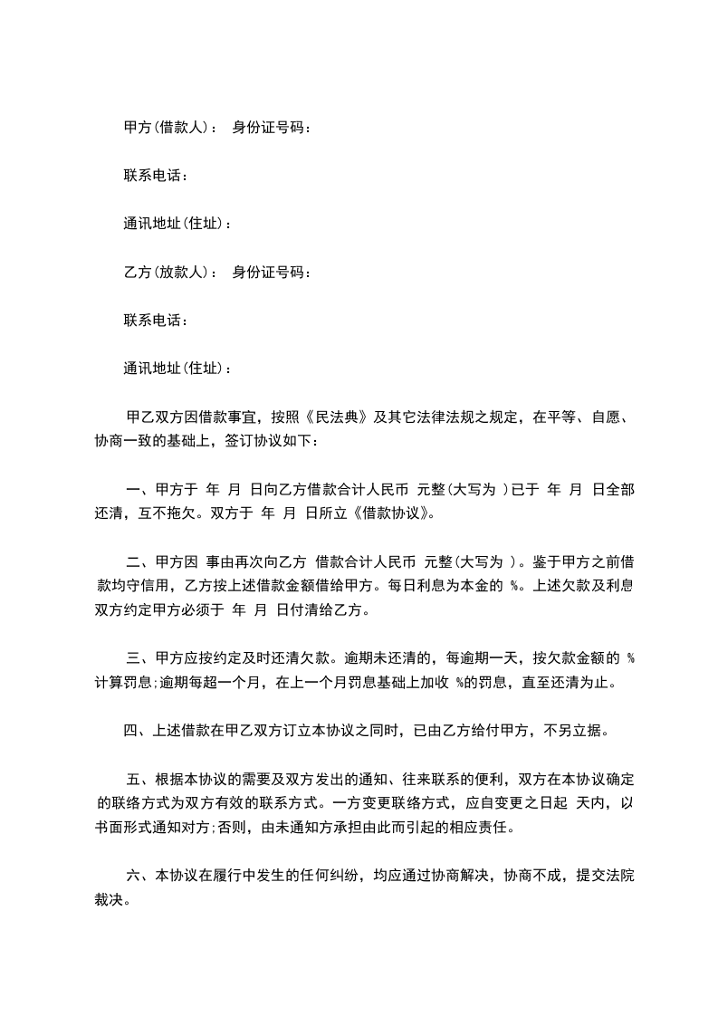 二、甲方因 事由再次向乙方 借款合计人民币 元整(大写为 )。鉴于甲方之前借款均守信用,乙方按上述借款金额借给甲方。每日利息为本金的 %。上述欠款及利息双方约定甲方必须于 年 月 日付清给乙方。