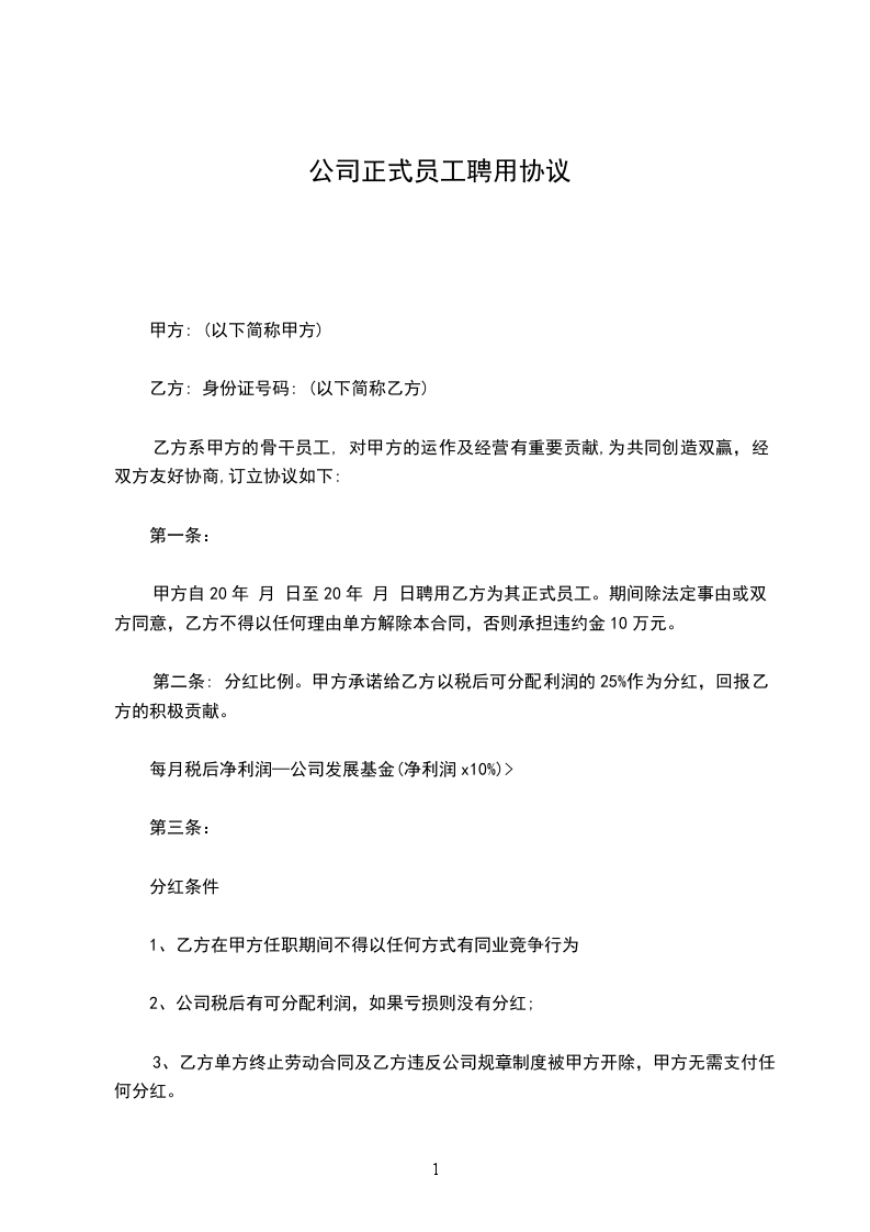 甲方自20年 月 日至20年 月 日聘用乙方为其正式员工。期间除法定事由或双方同意,乙方不得以任何理由单方解除本合同,否则承担违约金10万元。
