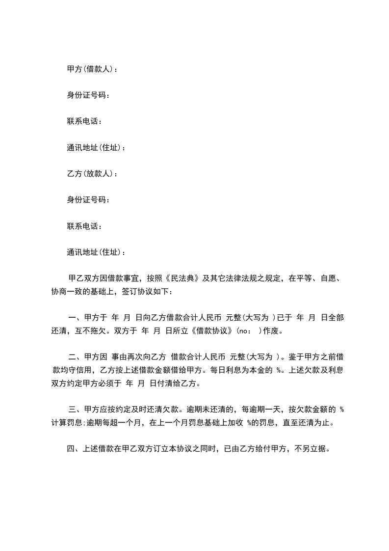 一、甲方于 年 月 日向乙方借款合计人民币 元整(大写为 )已于 年 月 日全部还清,互不拖欠。双方于 年 月 日所立《借款协议》(no: )作废。