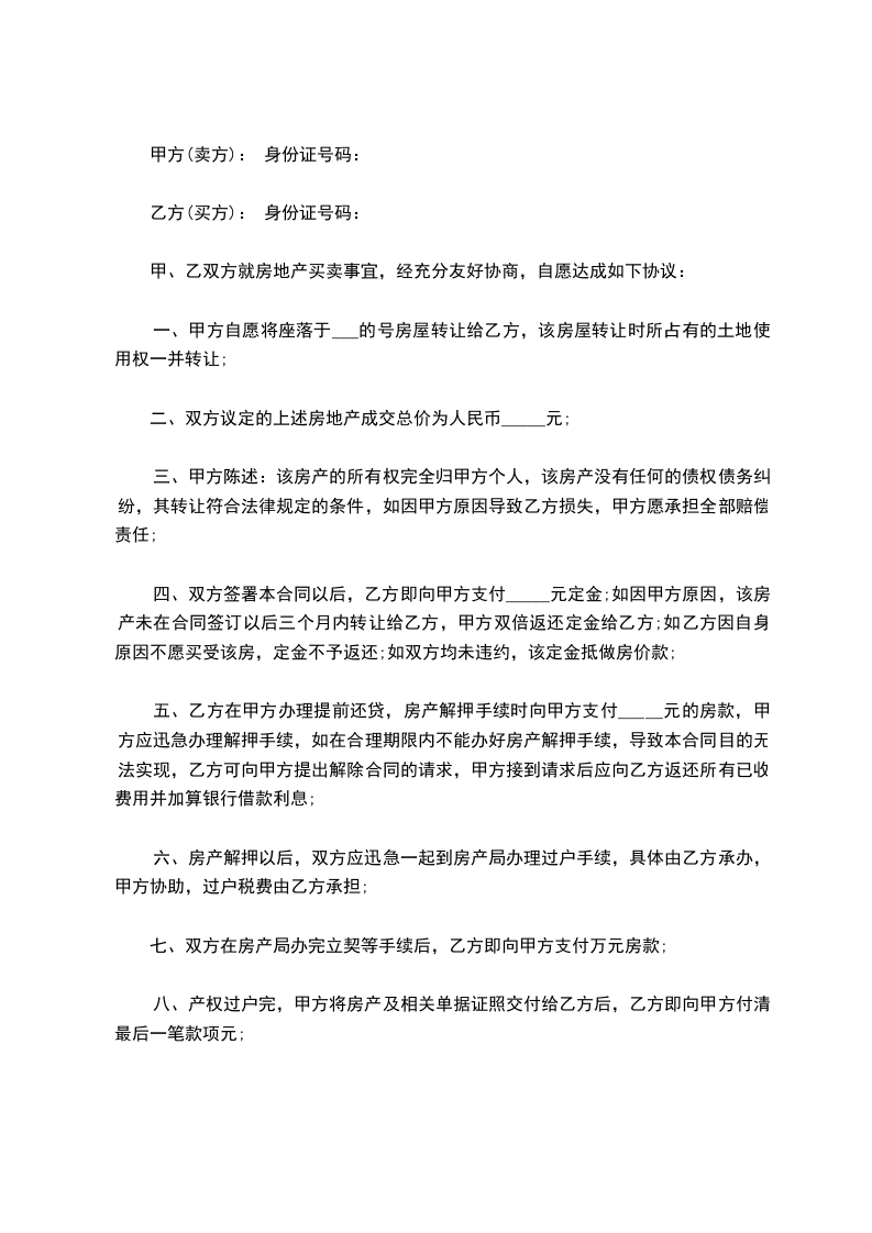 六、房产解押以后,双方应迅急一起到房产局办理过户手续,具体由乙方承办,甲方协助,过户税费由乙方承担;