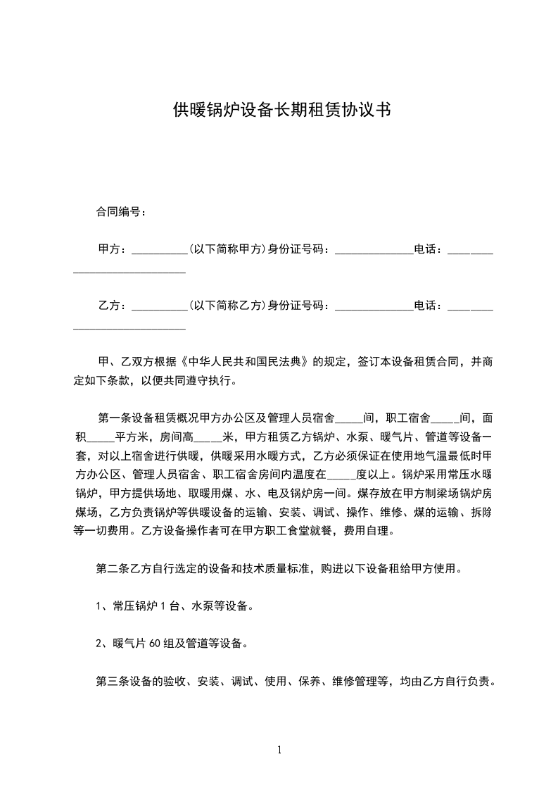 第一条设备租赁概况甲方办公区及管理人员宿舍20间,职工宿舍40间,面积1700平方米,房间高2.8米,甲方租赁乙方锅炉、水泵、暖气片、管道等设备一套,对以上宿舍进行供暖,供暖采用水暖方式,乙方必须保证在使用地气温最低时甲方办公区、管理人员宿舍、职工宿舍房间内温度在10度以上。锅炉采用常压水暖锅炉,甲方提供场地、取暖用煤、水、电及锅炉房一间。煤存放在甲方制梁场锅炉房煤场,乙方负责锅炉等供暖设备的运输、安装、调试、操作、维修、煤的运输、拆除等一切费用。乙方设备操作者可在甲方职工食堂就餐,费用自理。