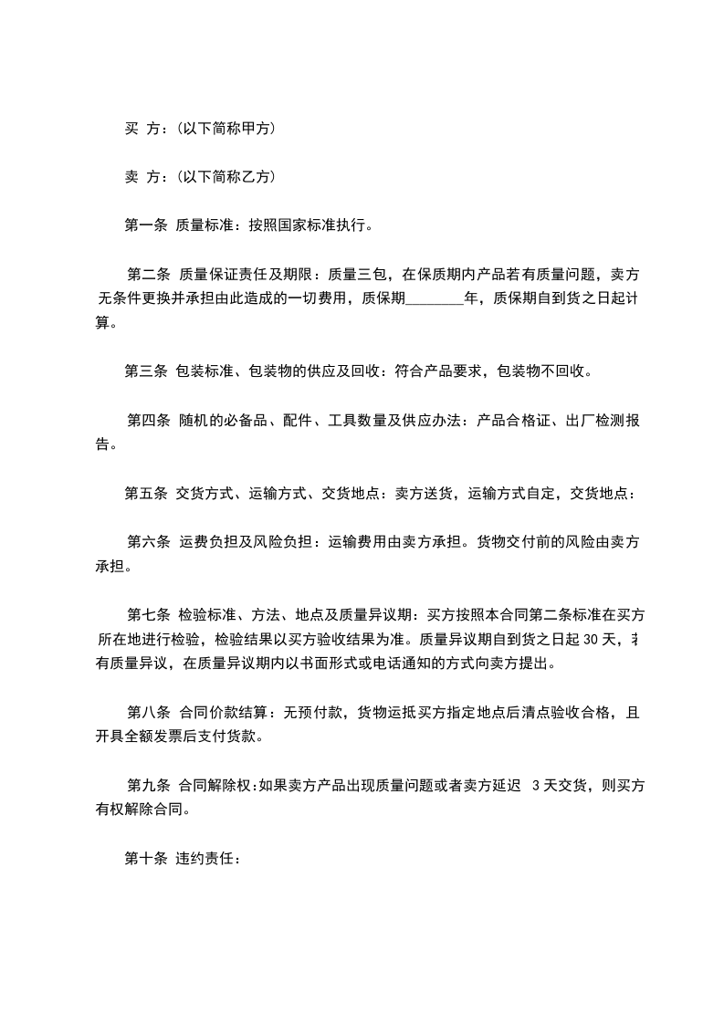 第九条 合同解除权:如果卖方产品出现质量问题或者卖方延迟3天交货,则买方有权解除合同。