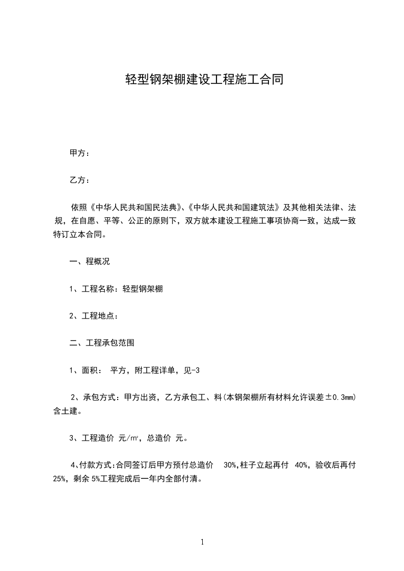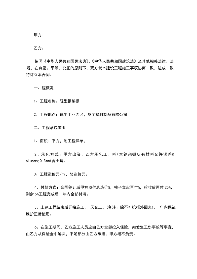 2、承包方式:甲方出资,乙方承包工、料(本钢架棚所有材料允许误差±0.3mm)含土建。