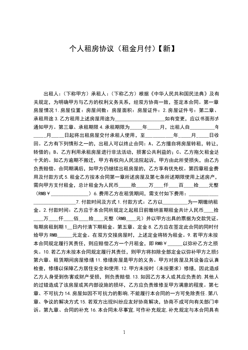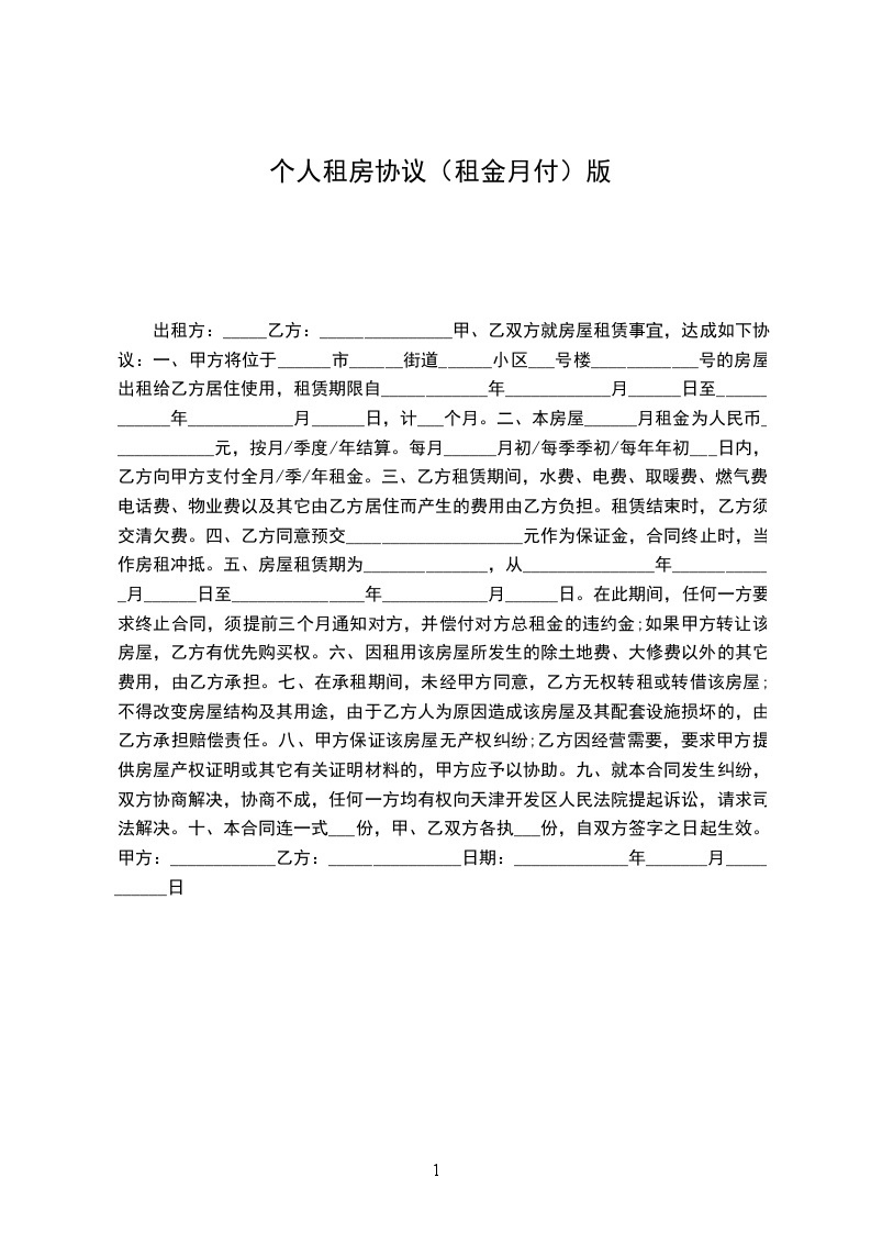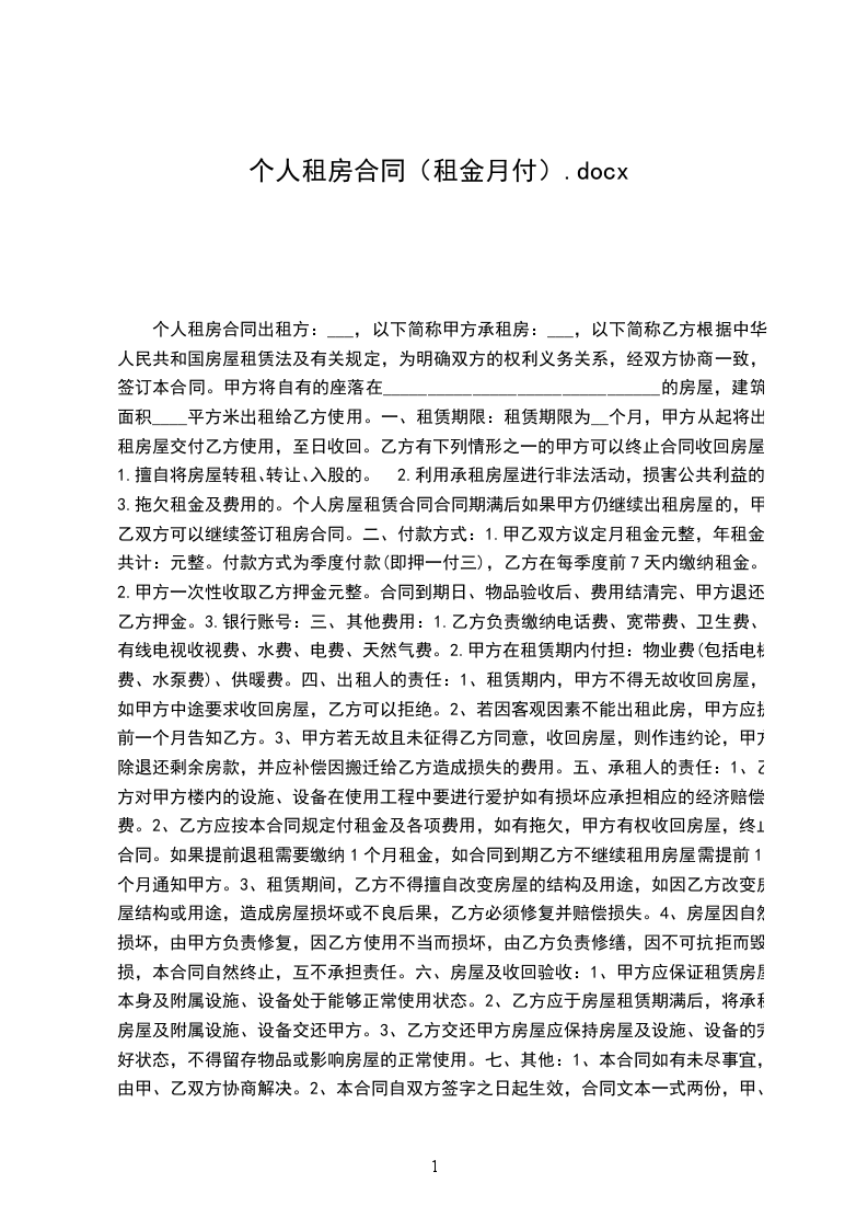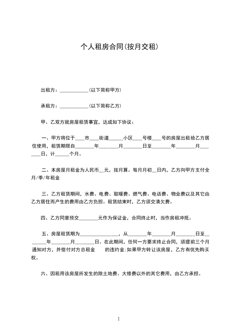 二、本房屋月租金为人民币_____元,按月交。每月月初15日内,乙方向甲方支付全月租金。