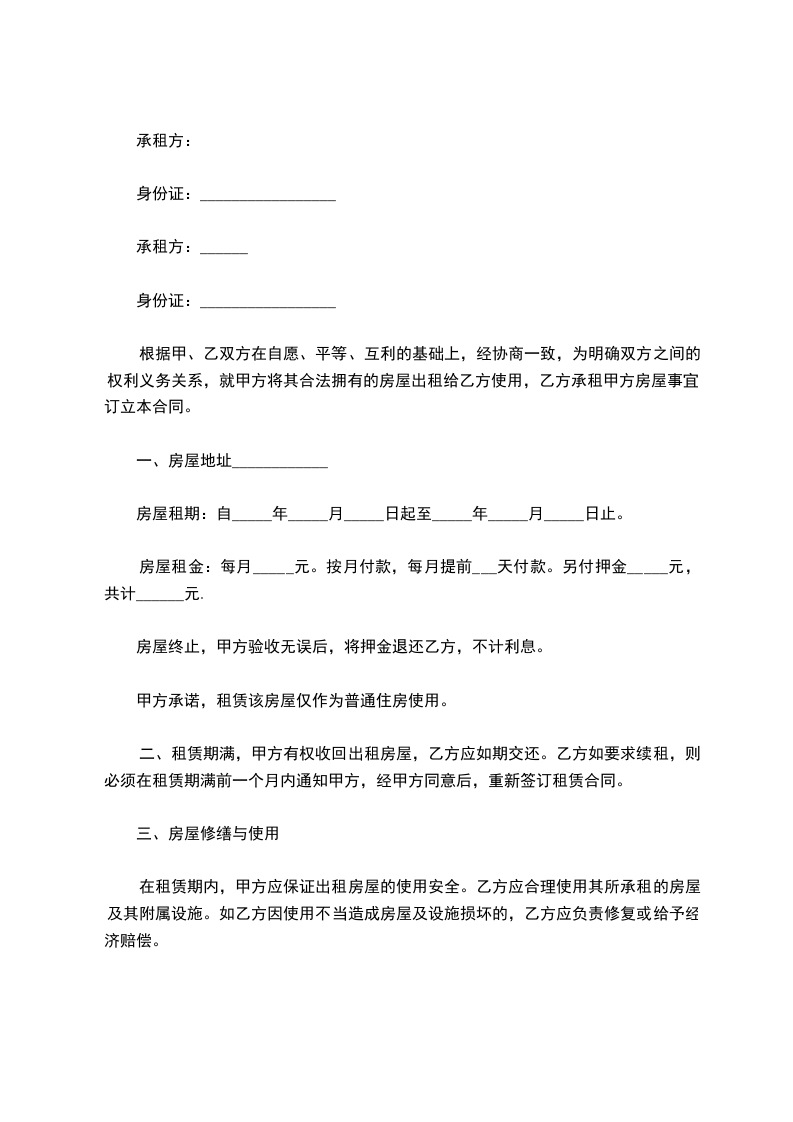 四、乙方不得随意损坏房屋设施,如需装修或改造,需先征得甲方同意,并承担装修改造费用。租赁结束时,乙方须将房屋设施恢复原状。