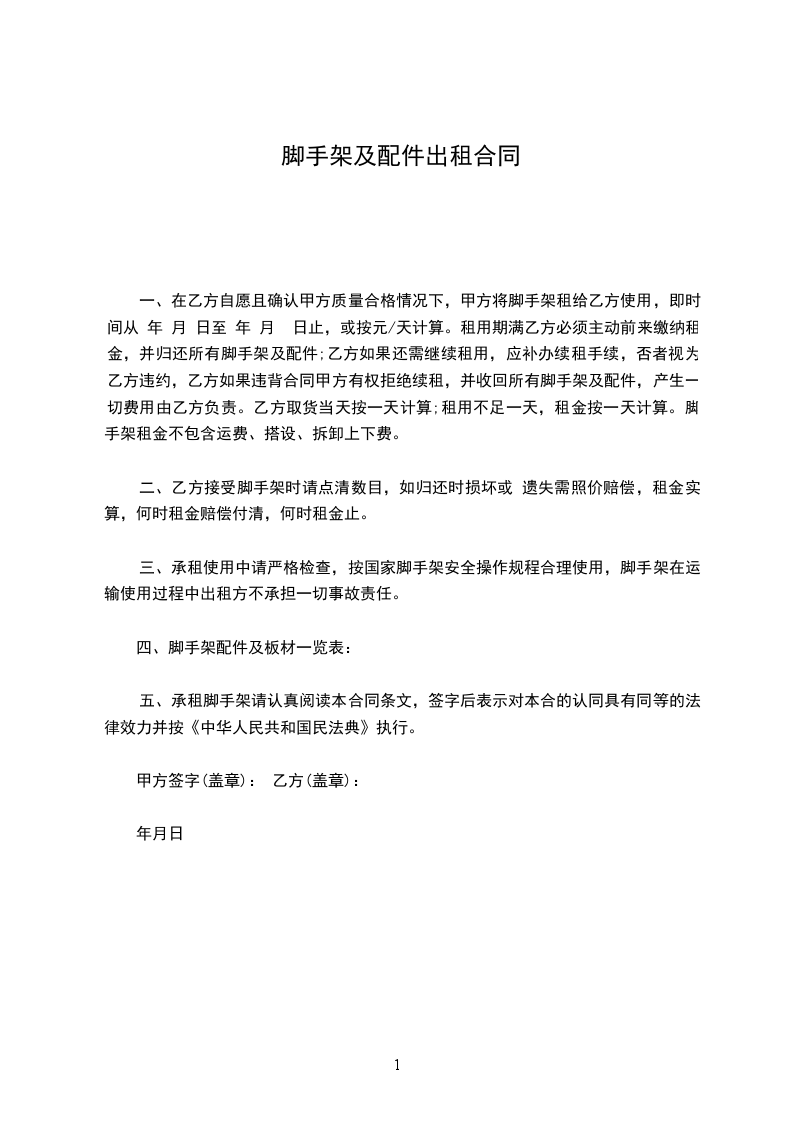 一、在乙方自愿且确认甲方质量合格情况下,甲方将脚手架租给乙方使用,即时间从 年 月 日至 年 月 日止,或按_____元/天计算。租用期满乙方必须主动前来缴纳租金,并归还所有脚手架及配件;乙方如果还需继续租用,应补办续租手续,否者视为乙方违约,乙方如果违背合同甲方有权拒绝续租,并收回所有脚手架及配件,产生一切费用由乙方负责。乙方取货当天按一天计算;租用不足一天,租金按一天计算。脚手架租金不包含运费、搭设、拆卸上下费。