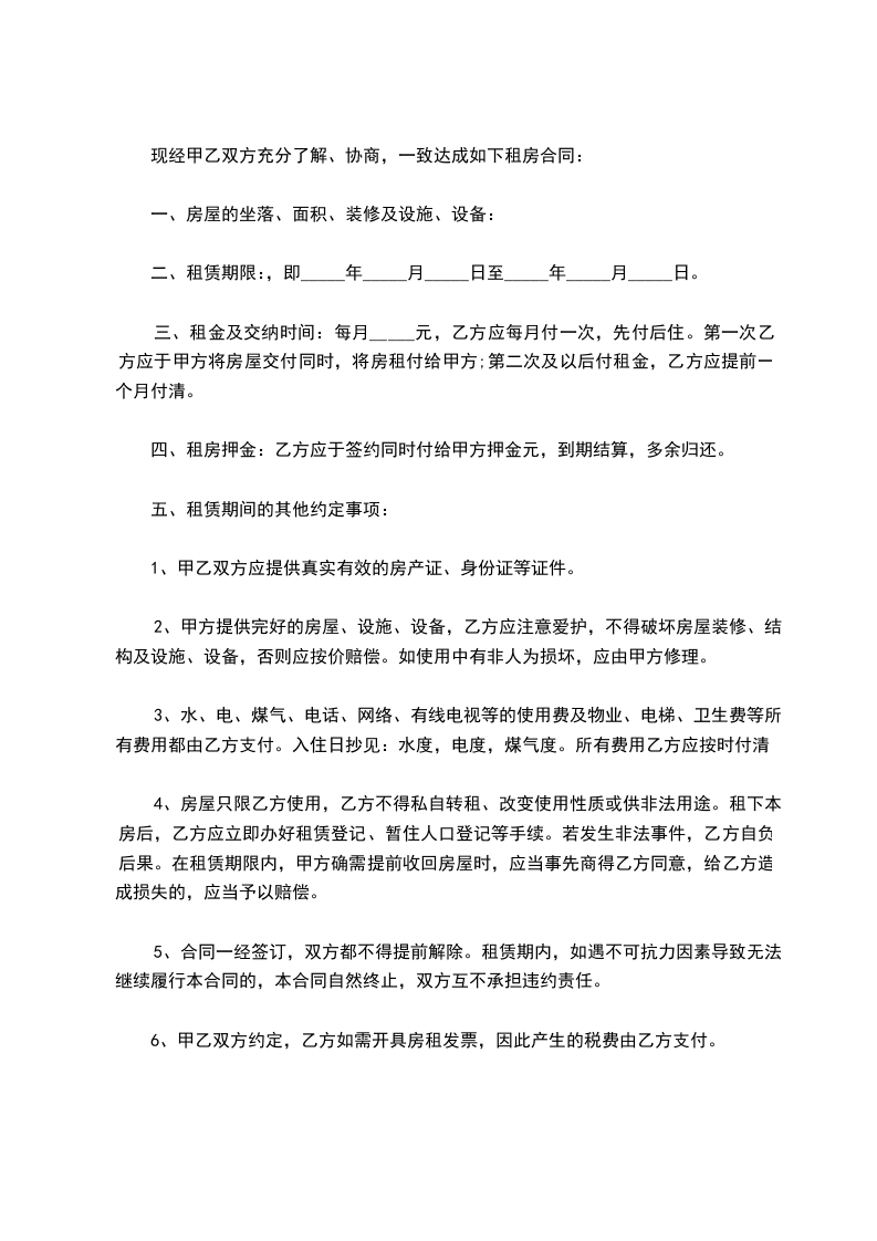 1、乙方一次付给甲方个月房租费,每月_____元整,共计人民币 元整。乙方租住上述房屋用途为 。