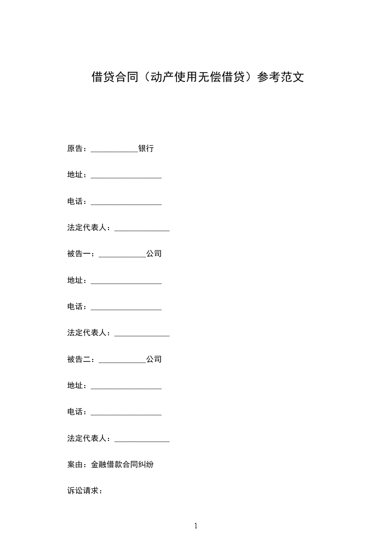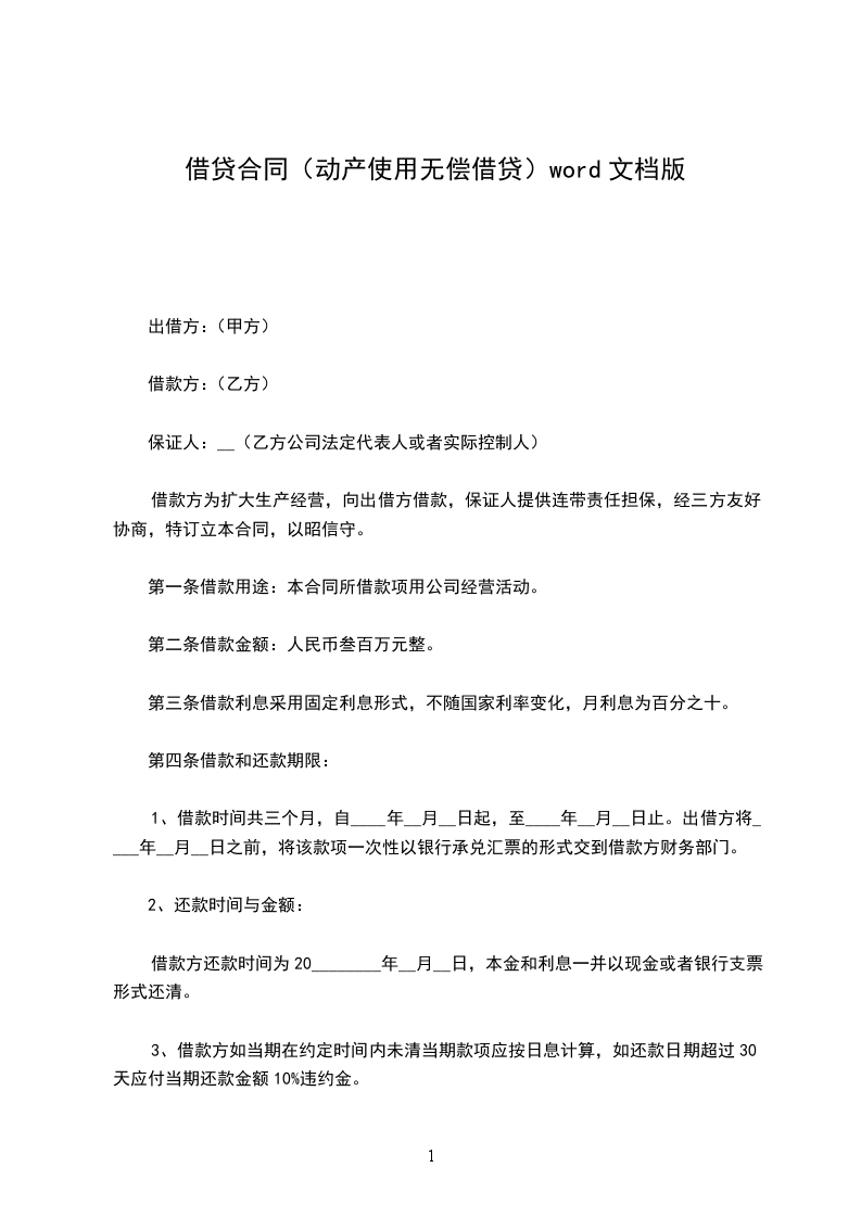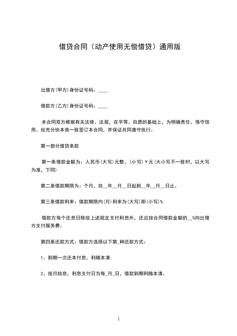 第一条 贷与人_________将第三条所载的动产,无偿贷与借用人_________使用,借用人约定_________使用后,返还其物。