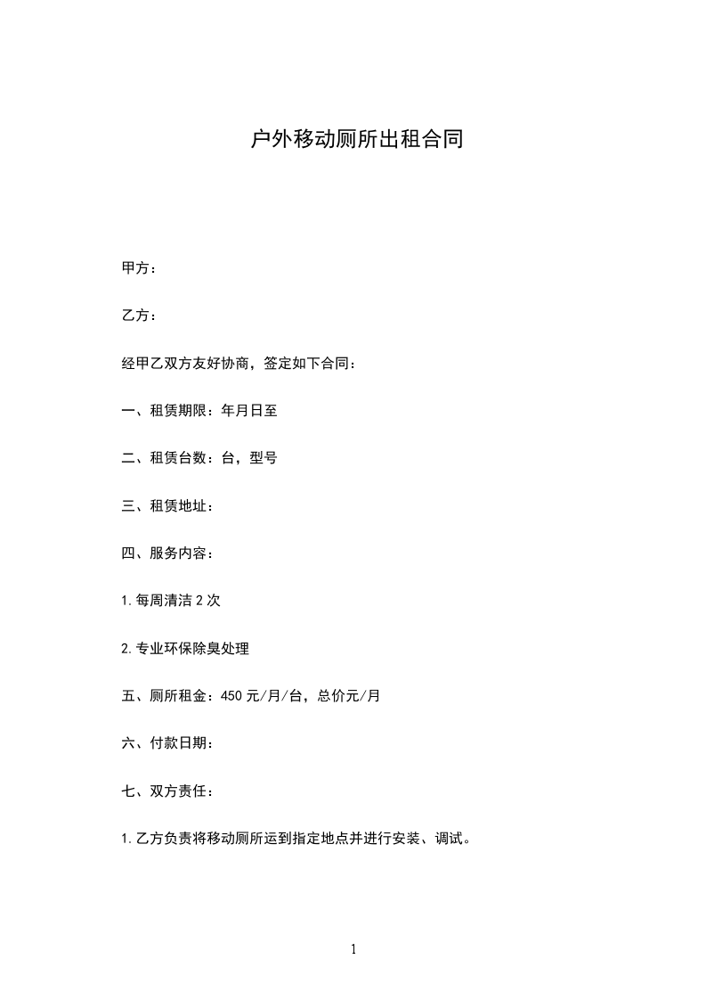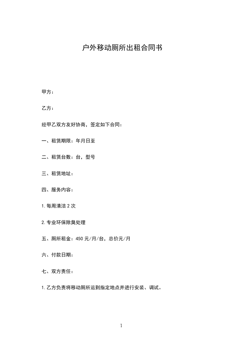 2.乙方负责定期清抽并对厕所进行专业环保除臭剂处理。 甲方应清除厕所摆放现场周围的障碍物, 若乙方到达现场后因有障碍物不能作业,