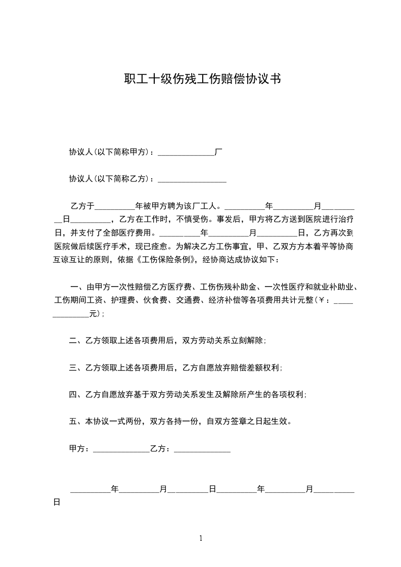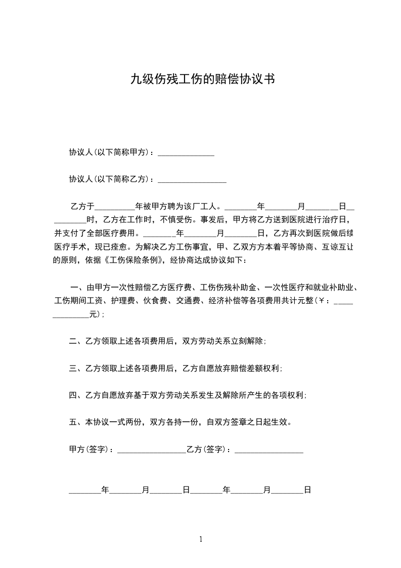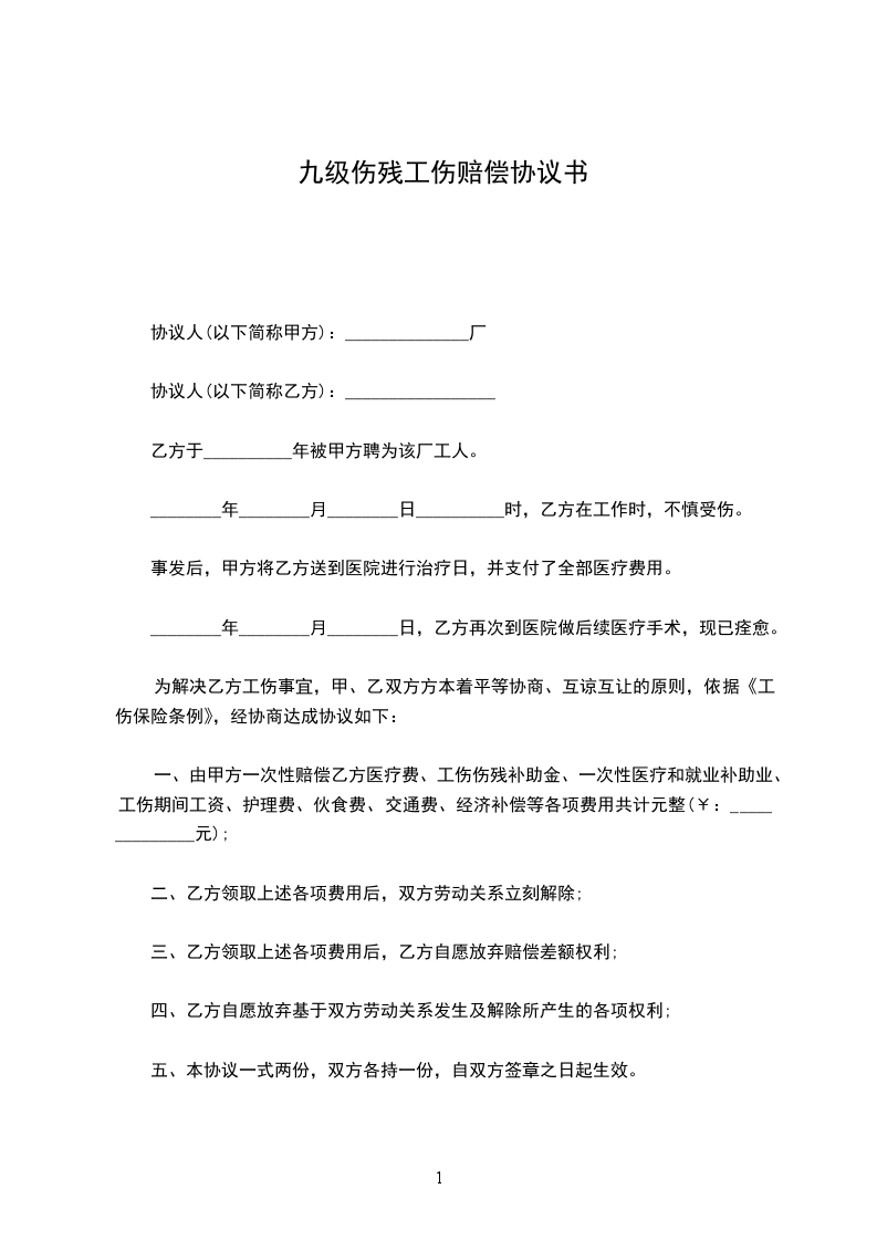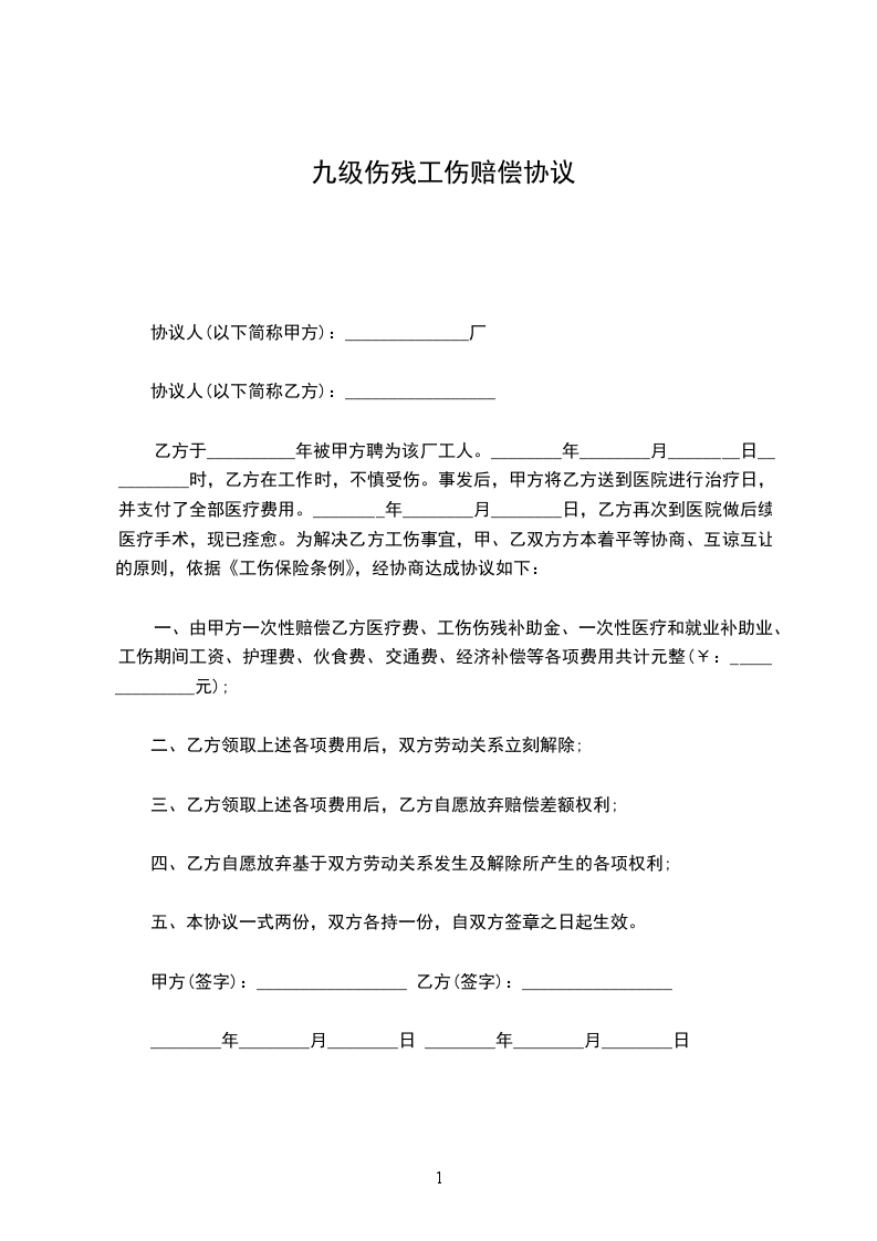 一、甲方于 _____年_____月_____日与乙方 协议约定, 针对乙方在甲方因工所受的五级伤残的赔偿事宜达成协议 ,总计赔偿金额包括一次性工伤补偿金、医疗补助费、伤残就业补助金、经济补偿等各项费用,合计人民币: 元整;以上赔偿金额只有在甲方与乙方解除劳动合同关系时才由甲方一次性支付给乙方。
