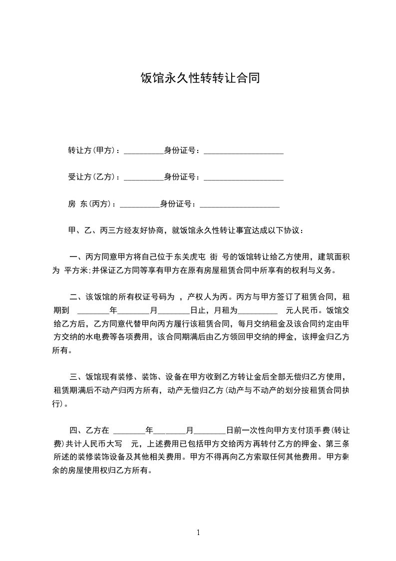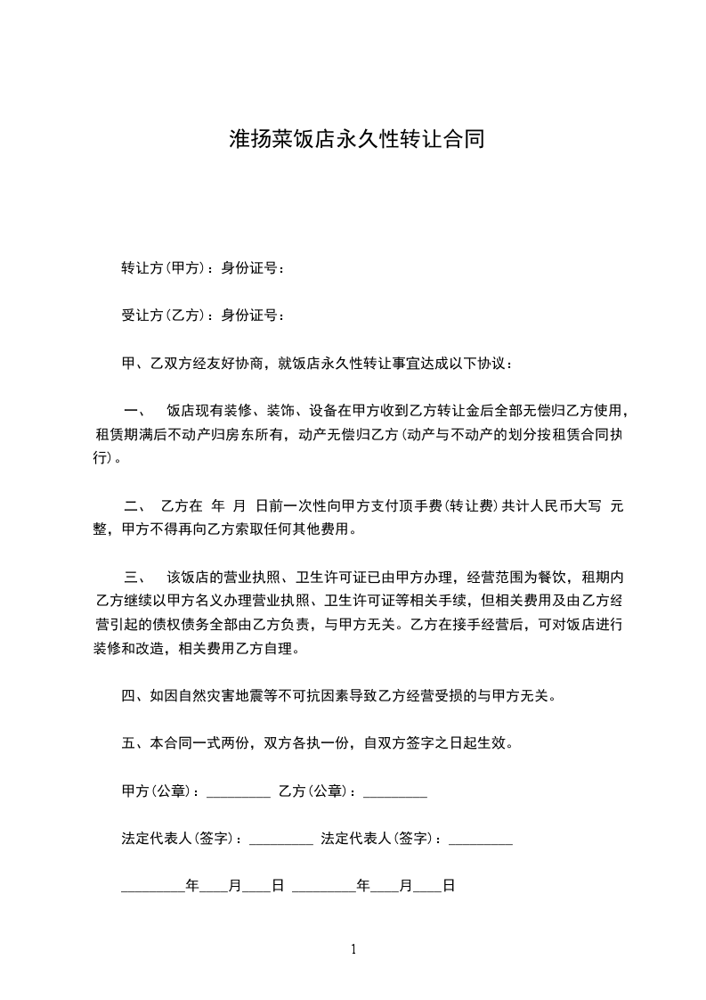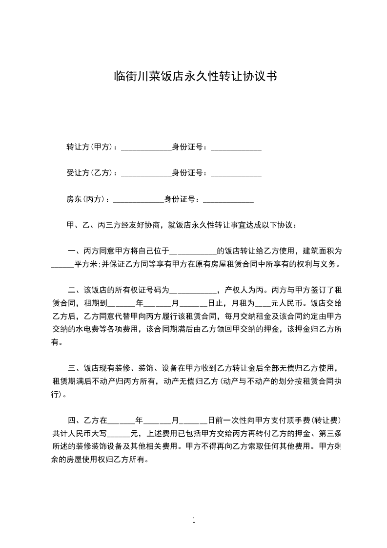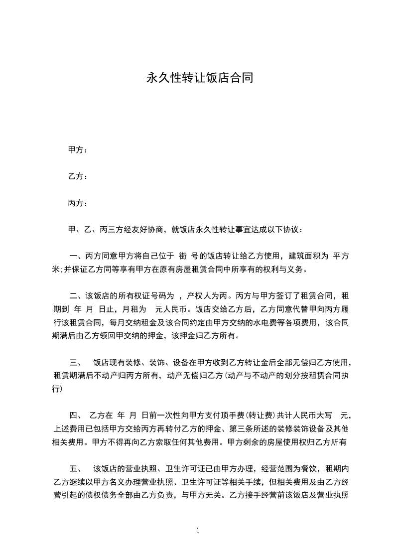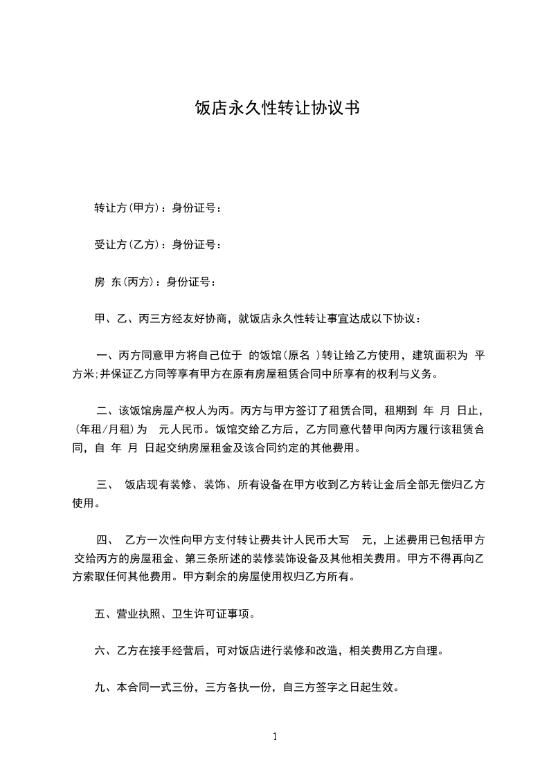 甲、乙双方经友好协商,就饭店永久性转让事宜达成以下协议: