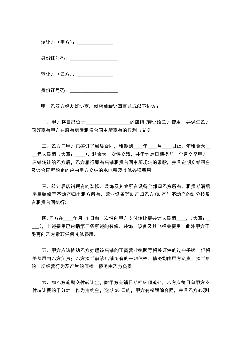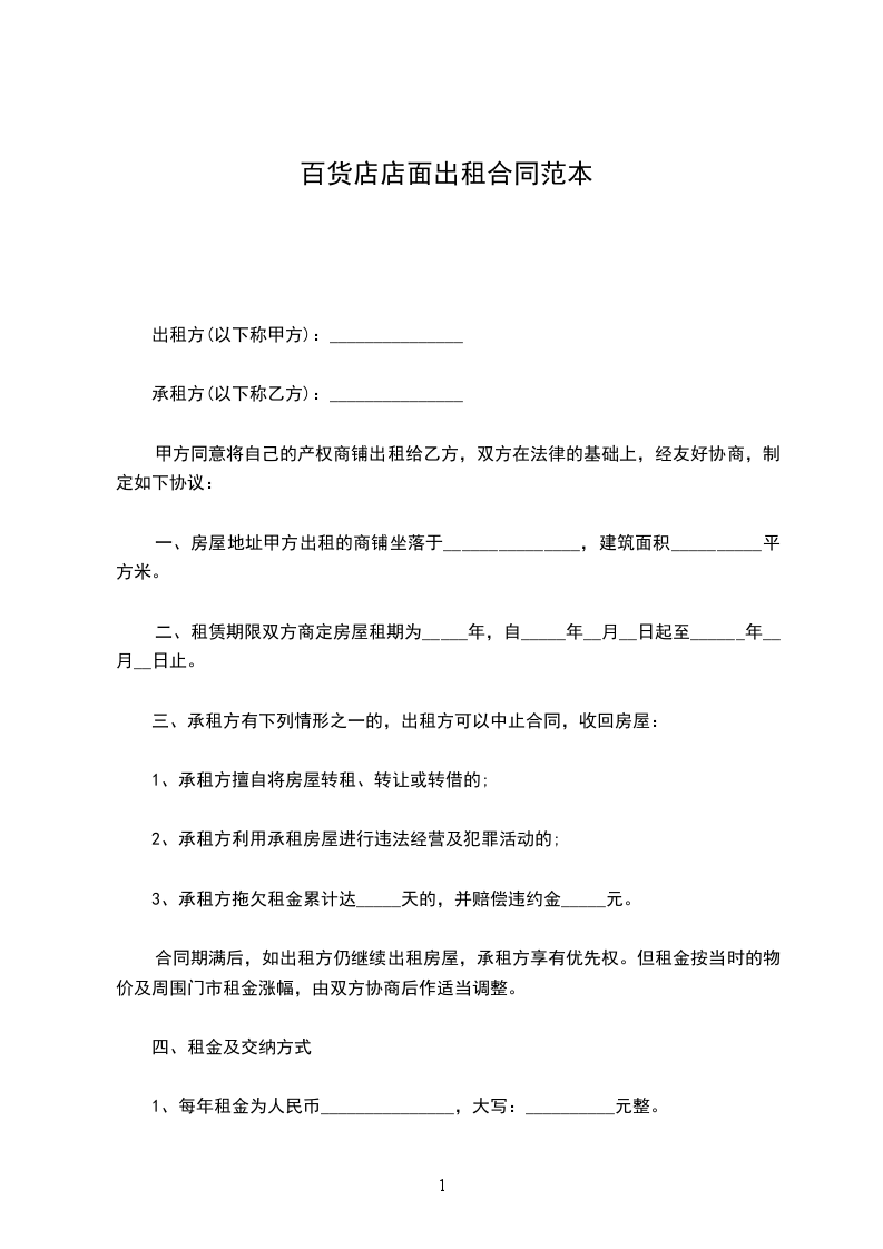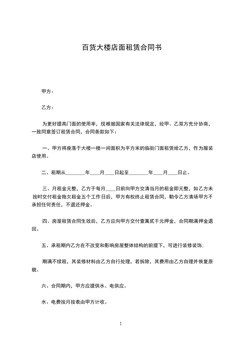 一、甲方将座落于大楼一楼一间面积为_____平方米的临街门面租赁给乙方,作为服装店使用。