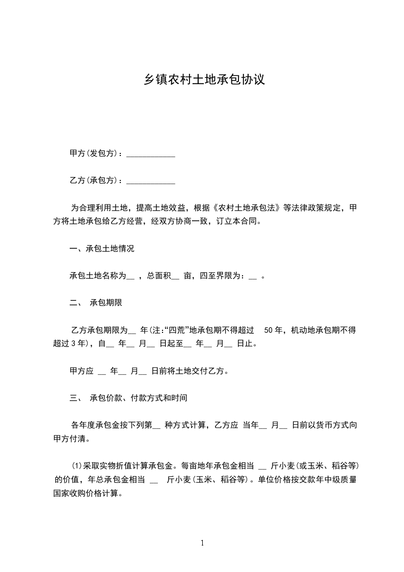 四、承包价格:本合同期限内按每亩_____元一次性结清。(结合自己情况,最好一年一付)