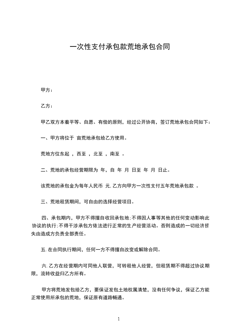 该荒地的承包金为每年人民币 元,乙方向甲方一次性支付五年荒地承包款 。