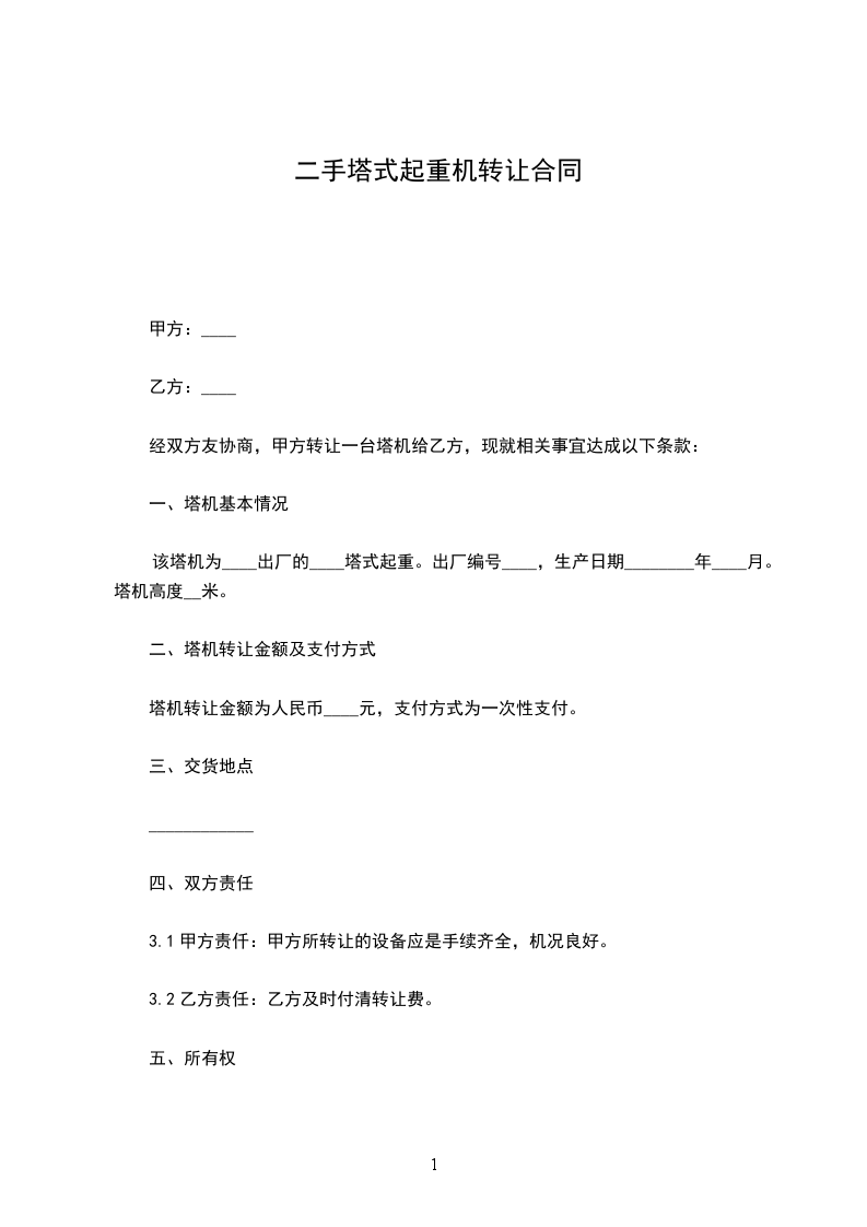 经双方友协商,甲方转让一台塔机给乙方,现就相关事宜达成以下条款: