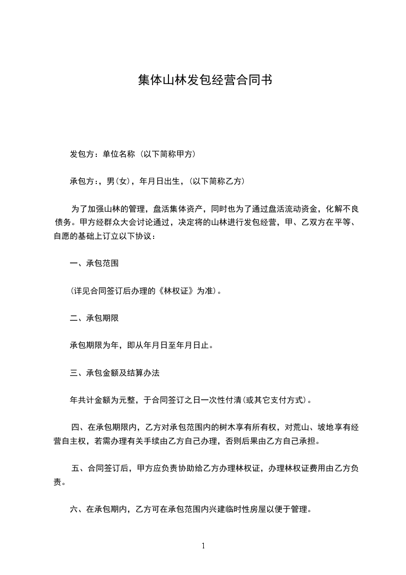 为了加强山林的管理,盘活集体资产,同时也为了通过盘活流动资金,化解不良债务。甲方经群众大会讨论通过,决定将的山林进行发包经营,甲、乙双方在平等、自愿的基础上订立以下协议: