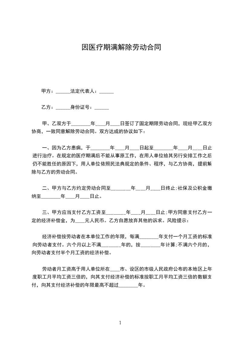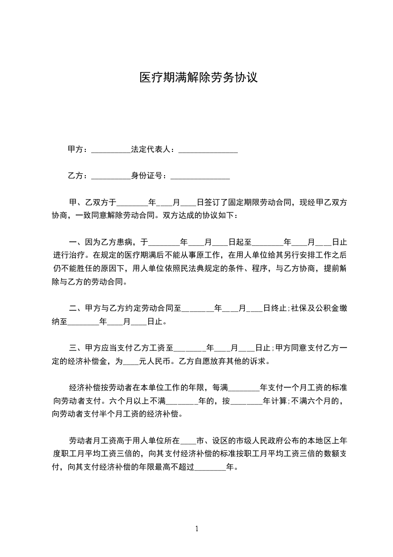 甲、乙双方于 年 月 日签订了固定期限劳动合同,现经甲乙双方协商,一致同意解除劳动合同。双方达成的协议如下: