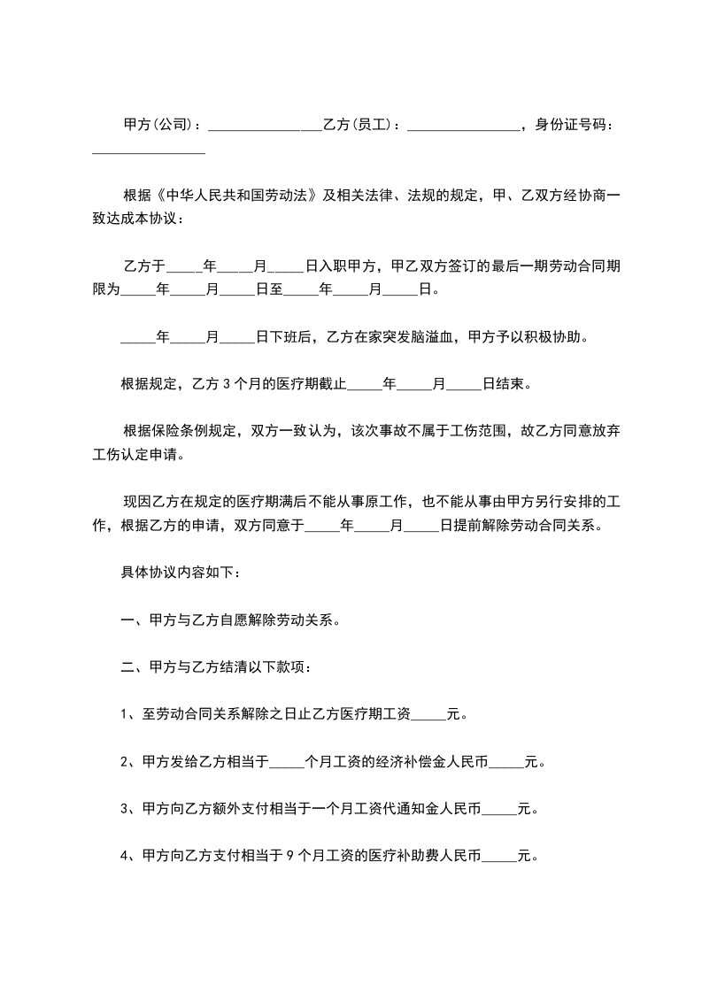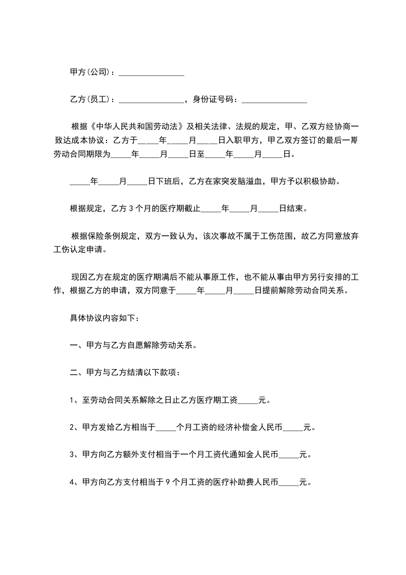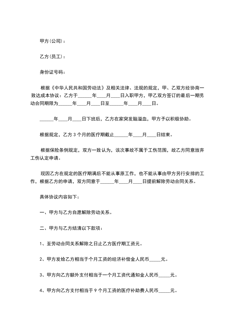 三、甲方应当支付乙方工资至____年____月____日止;甲方同意支付乙方一定的经济补偿金,为____元人民币。乙方自愿放弃其他的诉求。