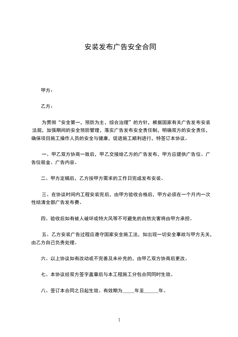 五、乙方安装广告过程应遵守国家安全施工法,如出现一切安全事故与甲方无关,由乙方自己负责处理。