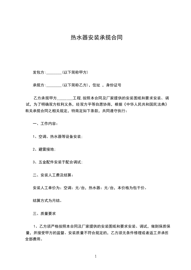 安装人工单价为:空调:元/台,热水器:元/台,本价格为包干价。