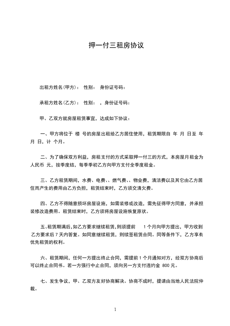 六、租赁期间,任何一方提出终止合同,需提前1个月通知对方,经双方协商后可以终止合同书。若一方强行中止合同,须向另一方支付违约金 800元。