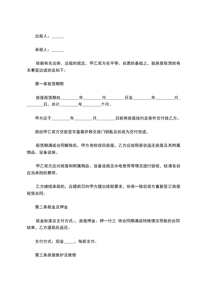 二、为了确保双方利益,房租支付的方式采取押一付三的方式,本房屋月租金为人民币 元,按季度结,每季季初乙方向甲方支付全季度租金。
