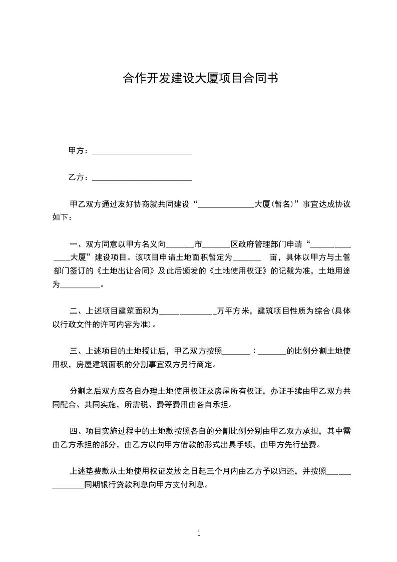一、双方同意以甲方名义向_______市_______区政府管理部门申请“______________大厦”建设项目。该项目申请土地面积暂定为_______ 亩,具体以甲方与土管部门签订的《土地出让合同》及此后颁发的《土地使用权证》的记载为准,土地用途为__________。