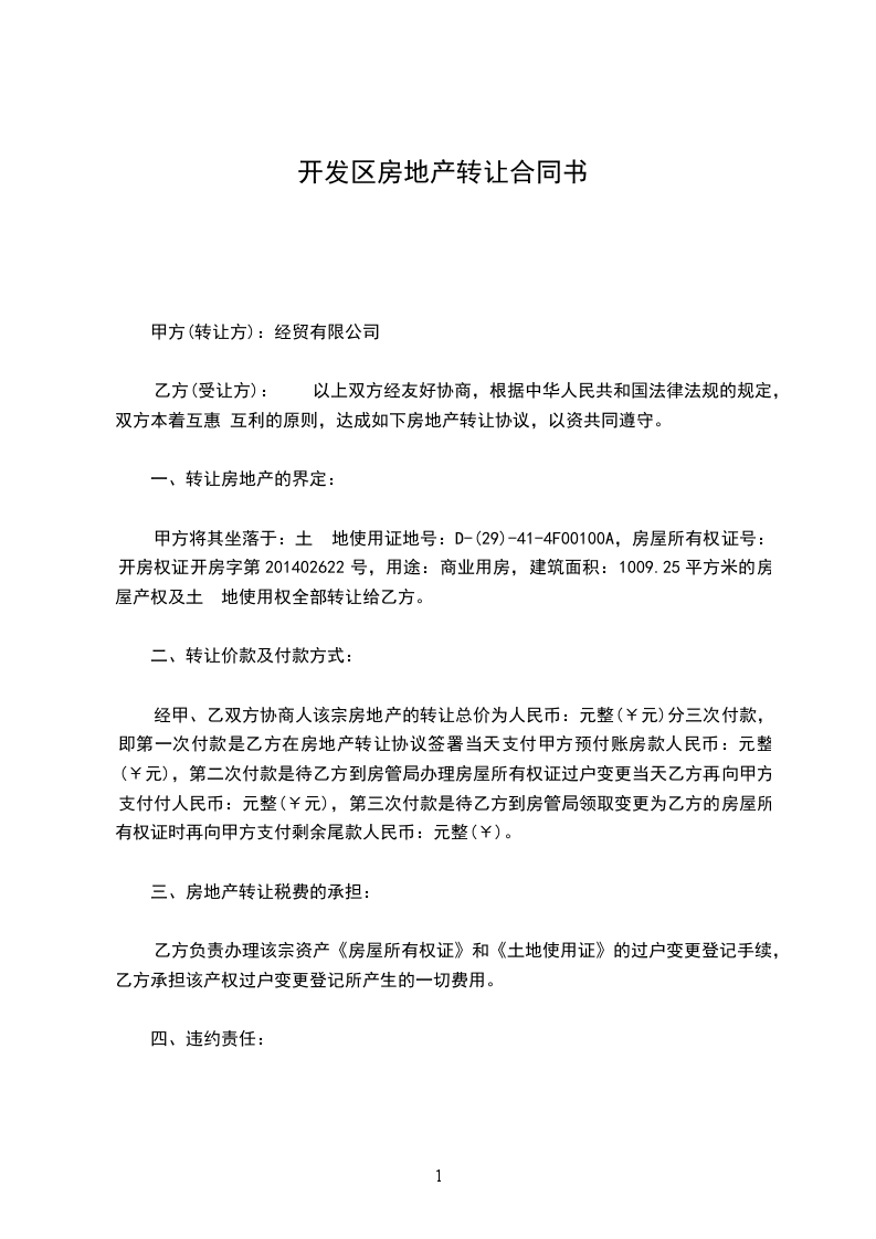 甲方将其坐落于:土 地使用证地号:D-(29)-41-4F00100A,房屋所有权证号:开房权证开房字第202402622号,用途:商业用房,建筑面积:1009.25平方米的房屋产权及土 地使用权全部转让给乙方。